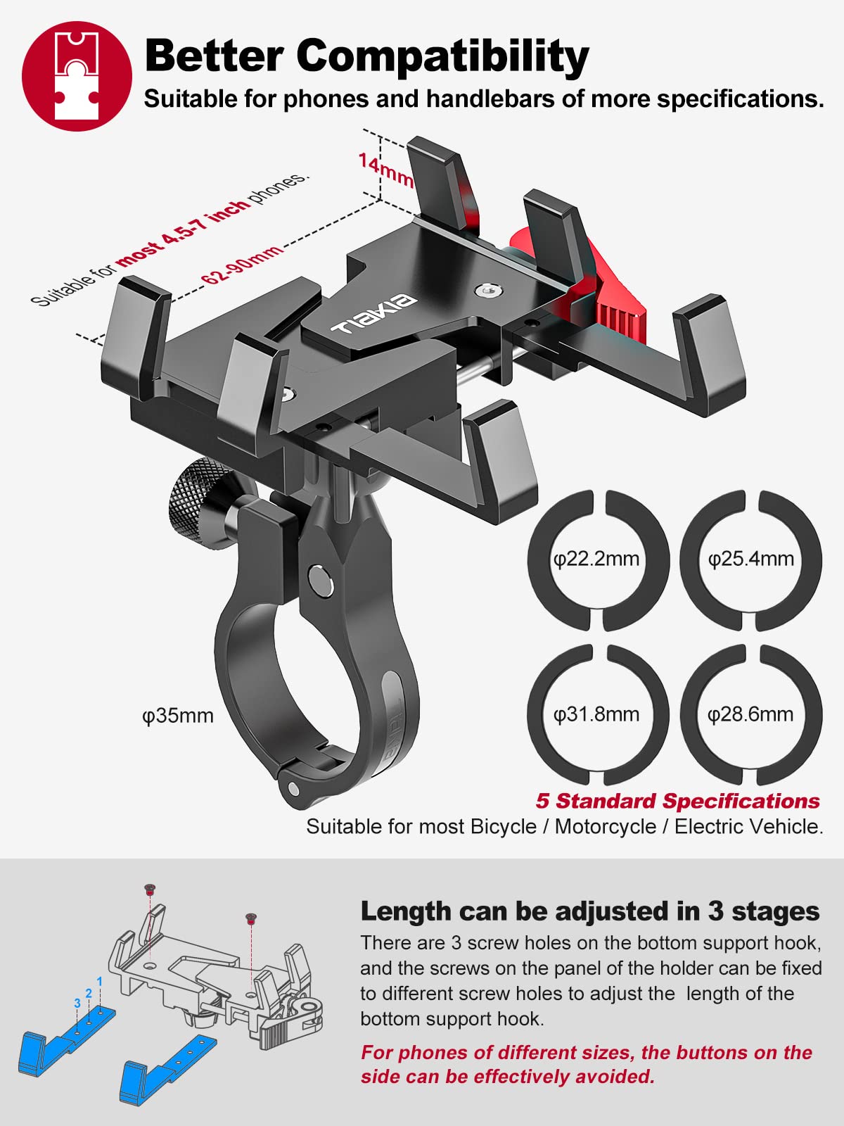 ?6-Claw Advanced Version Bracket? Break The Tradition! The Tiakia Bike Phone Mount Holder Is Newly Upgraded To 6 Telescopic Arms In Structure, And The Telescopic Arms Are Added At The Bottom, Which Makes The Installation More Compact And The Protection More In Place! In Thousands Of Installation Tests, This Phone Mount Has Shown The Best Stability On Bicycles And Motorcycles! | ?6063 Aluminum Alloy Body+Nylon Base?The Main Body Of This Motorcycle Phone Holder Is Made Of 6063 Aluminum Alloy Material And Processed By Cnc Machining;Stainless Steel Screw Fittings, Which Is Strong And Durable. The Support Base And Spherical Universal Joint Are Made Of Pa66 Nylon And 15% Glass Fiber Mixed Raw Materials Injection Molded, Which Makes The Base More Resilient And Can Reduce Vibration And Impact To A Certain Extent.Compared To Plastic And Silicone Phone Holder Mounts, It Is Stronger, Has No Vibration Or Noise, And Will Not Fade. | ?Exquisite Details? The Left And Right Telescopic Arms Fix The Left And Right Sides Of The Smartphone, And The Bottom Telescopic Arm Can Adjust The Position Of The Mobile Phone, Which Can Avoid The Side Buttons And The Camera Of The Mobile Phone From Being Blocked. The 6 Corners Of The Bike Cell Phone Mount Come With Silicone Pads, Which Will Not Scratch The Phone Screen. | ?Lock In 1 Second, No Tools Required? Exquisite Structure, Easy To Use. No Tools Required, With A Quick Release Button On The Right Side, It Only Takes 1 Second To Install Or Remove The Phone. Compared With The Traditional Motorcycle Phone Holder, This Aluminum Cell Phone Holder Saves 90% Of The Time. The Metal Swivel Mechanism Is Firm And Reliable, With Spherical Shape Universal Joint, Which Can Rotate 360