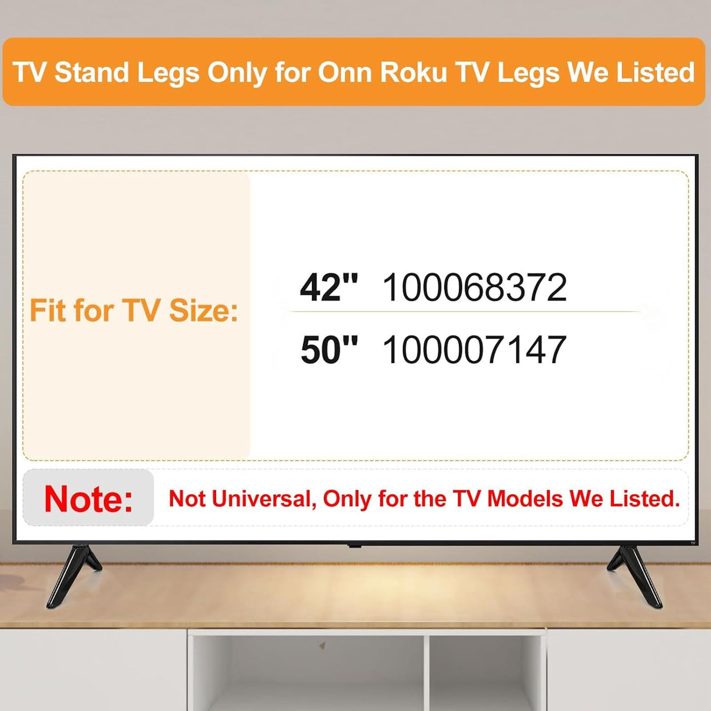 Q: What TV models are compatible with these TV stand legs?A: These TV stand legs are specifically designed for Onn Smart TVs, including models 40" (100005842), 42" (100068372), 50" (100007147), and 55" (100012586). Please ensure your TV model matches one of these before purchasing.