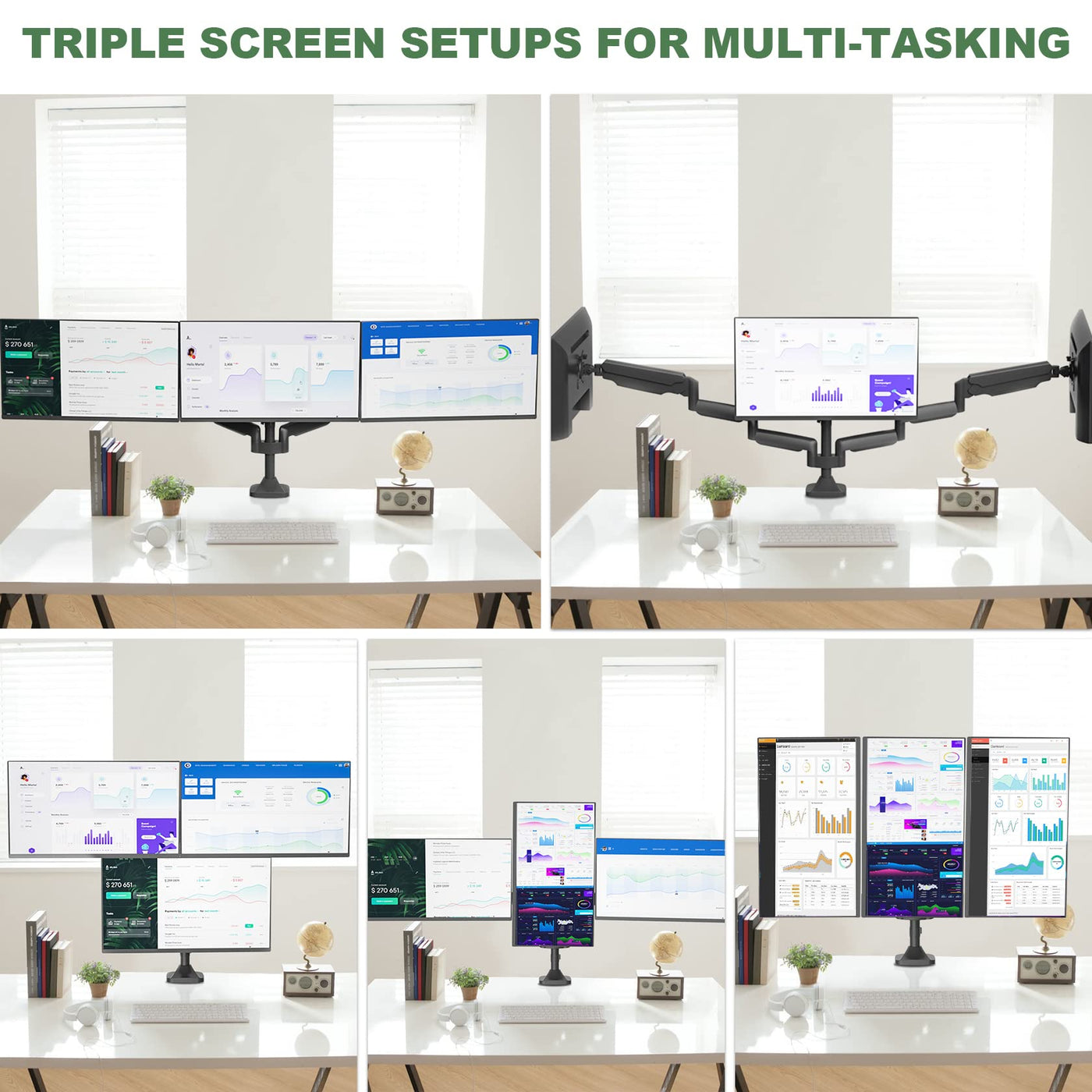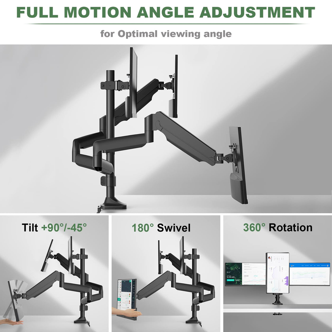 Create An Efficient Work Style With Three Screens With Upgravity Triple Monitor Mount! Holding 3 Monitors On 1 Stand Frees Up Much Valuable Space On The Desktop, Making Your Workstation Spacious And Clutter-Free. The Solid Construction And Heavy Duty Double C-Clamp Base Securely Hold 3 Screens Up To 32 Inch. The Gas Spring System Allows You Freely Set Your Monitors To Desired Height; The Full Motion Adjustments Help Find Optimal Angle To Work With More Comfort. The Detachable Integrated Cable Management System Helps Keep Av And Power Cords Out Of Sight And Organized. Wire Hook Can Be Placed Hex Wrench Tool For Future Adjustments.