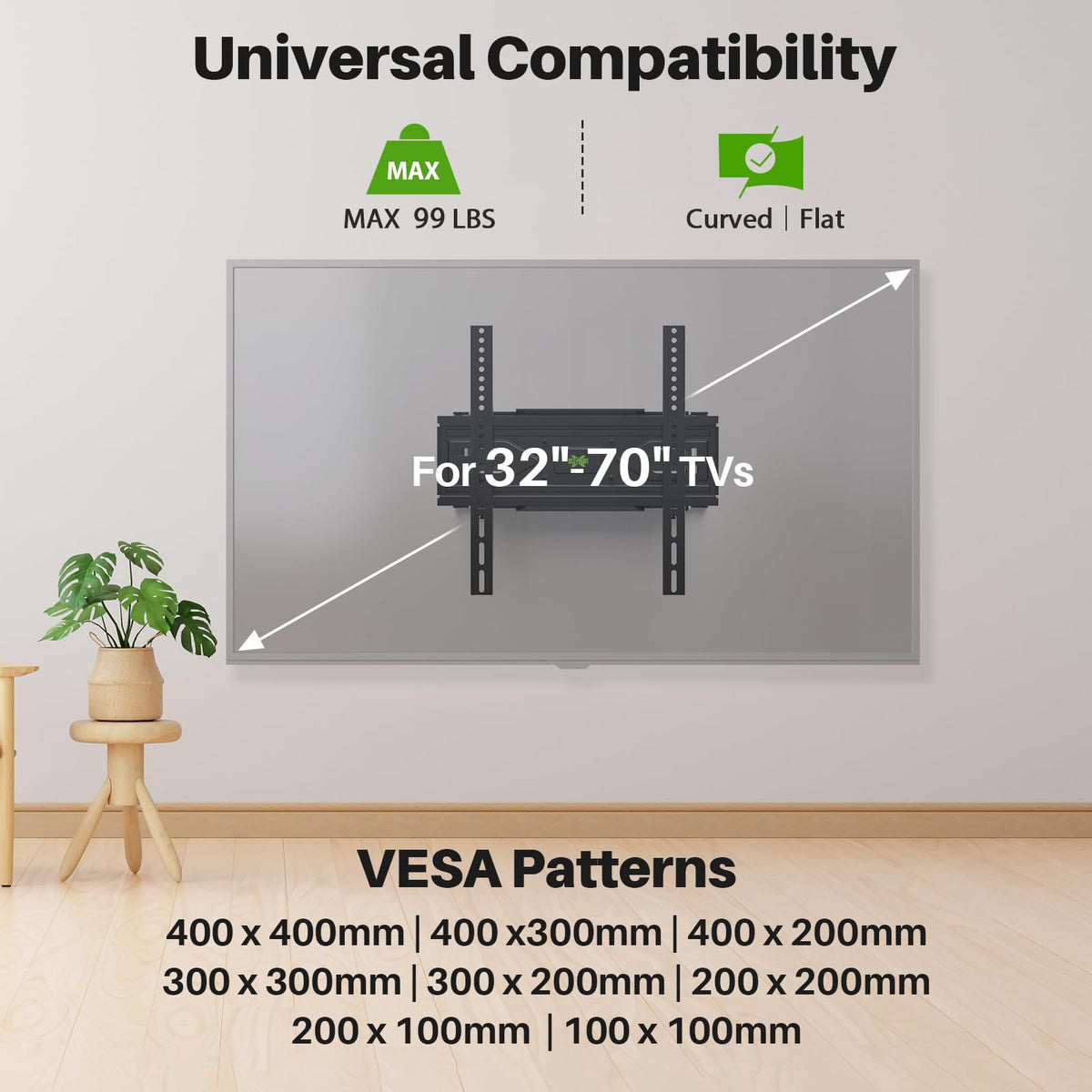 Size:32-70 Inch (Vesa400X400) Full Motion Universal Tv Mount This Wall Mount Tv Bracket Fits Most 32-70 Tvs Up To 99 Lbs, With Vesa Size Available Vesa 75X75Mm To 400X400Mm(Available Vesa Patterns: 75*75Mm, 100*100Mm, 200*100Mm, 200*200Mm, 400*200Mm, 400*400Mm). Full Motion Tv Wall Mount This Tv Bracket With Dual Articulating Arms Includes +5/-12Tilt, 45Swivel( Maximum Swivel Angle Depends On Your Tv), +/-4Post-Installation Adjustment Allows The Perfect Tv Leveling. This Full Motion Tv Wall Bracket Can Pull Out To 13.89 And Retract Back To 2.59 . More Wall Mounting Options Concrete Wall,Wood Studs, Brick Wall. Easy Installation Simple 3-Step Install 1) Screw The Brackets To The Tv 2) Bolt The Wall Plate To The Wall 3) Attach Your Tv To The Wall Plate Customer First, Quality First Customer First And Quality First Are Our Business Principle. Our Us-Based Customer Support Are Always Ready To Help. If You Have Any Concerns Before You Purchase Or Any Installation Problems, You Can Feel Free To Contact Us. Your Safety Is Our Priority We Have Over 20 Years Tv Mounts Manufacturing Experience. All Of Our Tv Brackets Are Designed, Produced And Tested With The Highest International Standards. Trusted By Thousands Of Families And Companies Who Have Installed Our Safe Mounts Into Their Spaces.