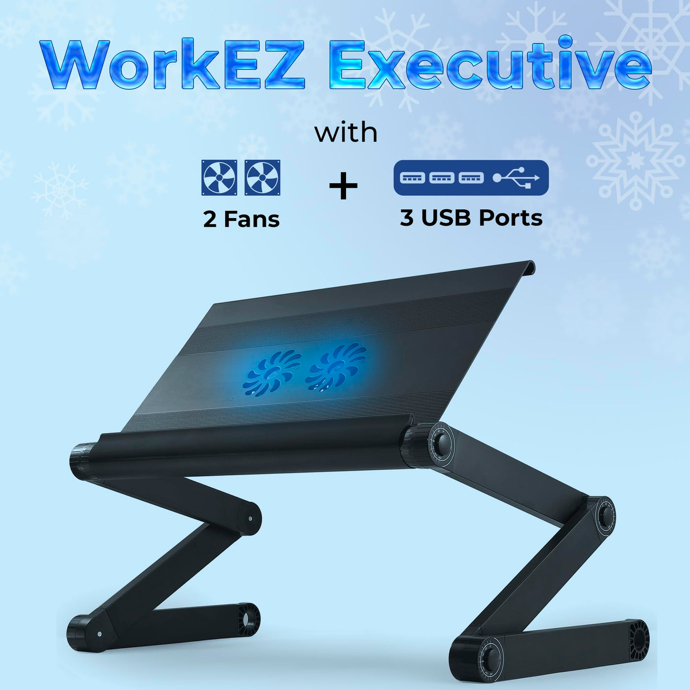 Experience Unparalleled Comfort With Our Foldable Laptop Stand For Bed And Desk. The Foldable Laptop Table Creates A Portable Laptop Desk That Improves Your Computing Comfort On The Couch, Recliner Of Bed. The Bed Table For Laptop Holds Notebooks Hands Free So You Can Stretch Out And Get Comfortable. Place This Laptop Bed Desk Over Your Legs Or Let It Hold Your Laptop Next To You As A Laptop Bed Table. It'S The Widest, Most Comfortable Lap Desks For Adults That We Make! Not Just For The Bed, This Computer Stand For Laptop Makes A Comfortable Couch Desk For Laptop That Improves Your Posture And Holds Macbooks Hands-Free On The Couch Or Recliner. Enjoy Computing Anywhere With Our Adjustable Laptop Desk For Couch, Laptop Desk For Lap, Laptop Stand For Couch, Laptop Bed Tray, And Laptop Table For Bed. If You Prefer Working On Your Computer Seated, The Adjustable Height And Tilt Nature Of This Desktop Stand For Laptops Improves Your Posture And Helps You Sit Up Straight. The Foldable Laptop Stand Collapses Flat Making A Convenient Portable Desk For Laptop. The Portable Lap Desk Is Easy To Put Away When Not Needed. This Adjustable Laptop Table Helps Cool Your Computer. The Laptop Lap Desk With Cooling Fan Has Two 3' Cooling Fans And The Aluminum Panel On This Laptop Couch Desk Dissipates Heat To Cool Laptops. The Bed Laptop Desk Has 3 Usb Ports That Power Devices. With The Widest Panel In The Workez Foldable Lap Desk Line Of Products, Workez Executive Is A 17 Inch Laptop Stand For Bed. If You'Re Shopping For A Cooling Laptop Stand Why Not Go With The Most Elegant Model That'S Built By A Company With Over A Decade Of Experience? Not Just A Bed Laptop Table, This Computer Bed Is Also A Book Holder For Reading In Bed. The Laptop Desk Stand Is Also A Book Reading Stand. Workez Executive - The Ultimate Laptop Stand Adjustable Height Tilt That Doubles As A Portable Standing Desk For Laptops.