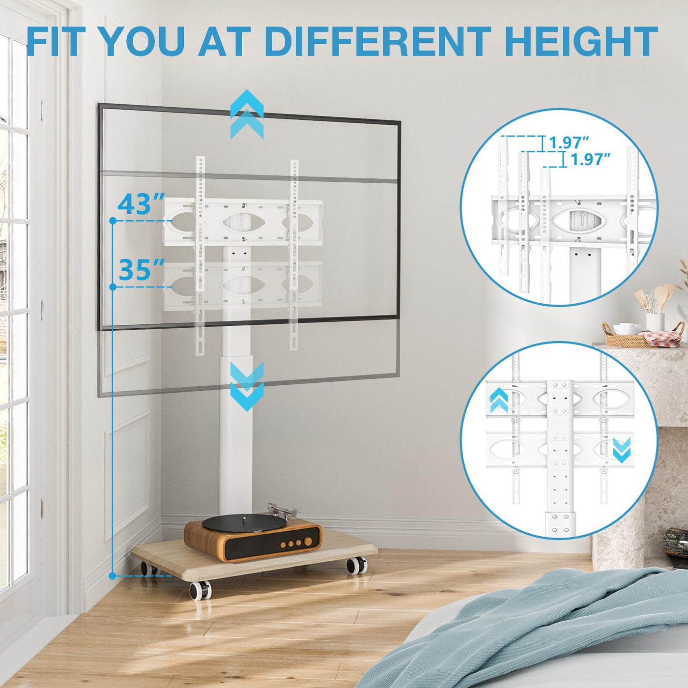 ?? Tv Stand For Living Room Specifications: ? Popular Compatible Screen Sizes (Not Comprehensive): 32 36 37 39 40 42 43 48 49 50 55 60 65 70 ? Screen Types: Most Lcd, Led, Oled, 4K, Smart, Flat Screen And Curved Tvs, Computer Monitors, Or Displays ? Support Vesa Size: 100X100Mm, 200X100Mm, 200X200Mm, 300X200Mm, 300X300Mm, 400X200Mm, 400X300Mm, 400X400Mm. ? Tv Stand White Fits Samsung Lg Sony Sharp Panasonic Philips Tcl Hisense Toshiba Insignia, Ect. ? Corner Tv Stand Comes With 5-Year Manufacturer Warranty, Friendy And Prompt Usa Local Customer Service. ?? Features: ? White Tv Stands For Living Room Is Very Sturdy And Well Made Of White Thicker Metal And Wooden Base. ? Tv Rolling Stand Height Adjustable Allows You To Enjoy Comfortable Viewing Height. ? Swivel Function Can Expand The Viewing Angle To Choose The Best Viewing For Tv Entertainment. ? The Wheels Lock Or Free Roll Whichever You Like, Super Easy And Practical Mobile Tv Stand On Wheels. ? Tv Cart Rolling Tv Stand Sits Fairly Close To The Wall, You Are Able To Have A Table Or Cabinet In Front Of It. ? Cable Management Hook And Loop Straps Behind The Slim Tv Stand Keep It Clean And Organized. ? Movable Tv Stand Comes With An Easy To Follow Instruction Manual For Quick And Easy Installation. ? Tv Stand Wheels Is Easy To Move The Tv Wherever You Are - Kitchen, Exercise Bike, Dining Table, Apartments, Home Office, Etc.