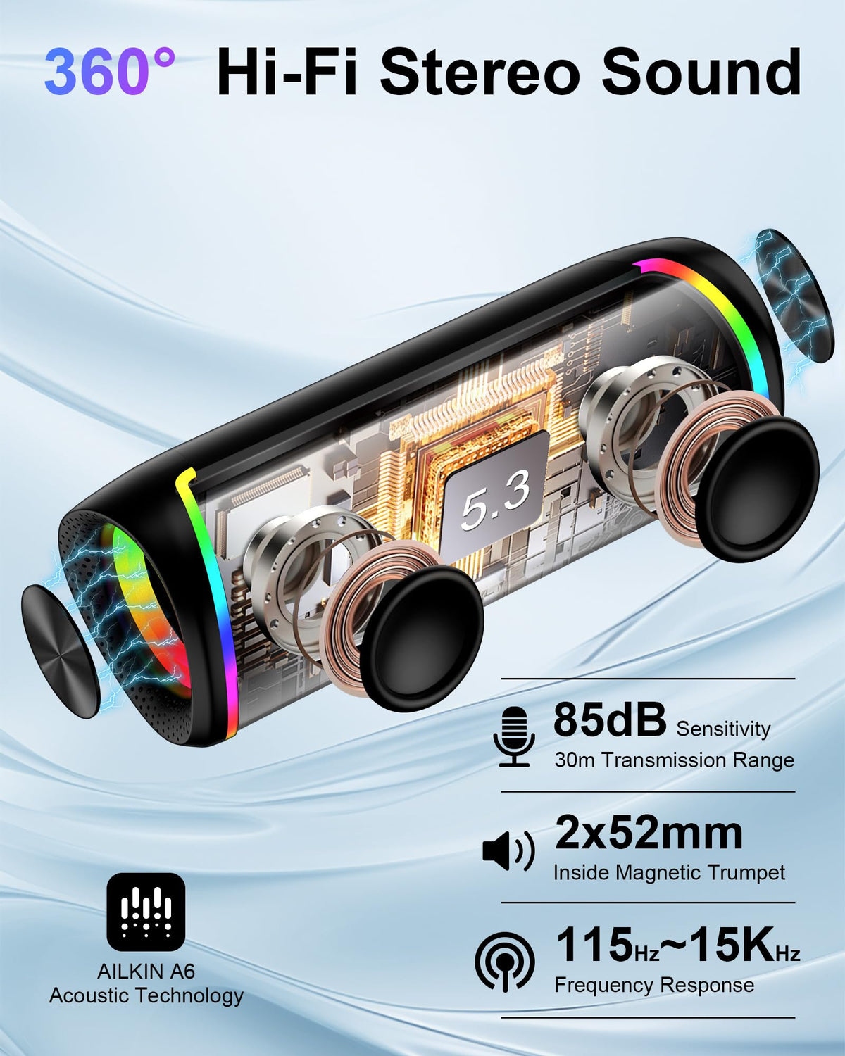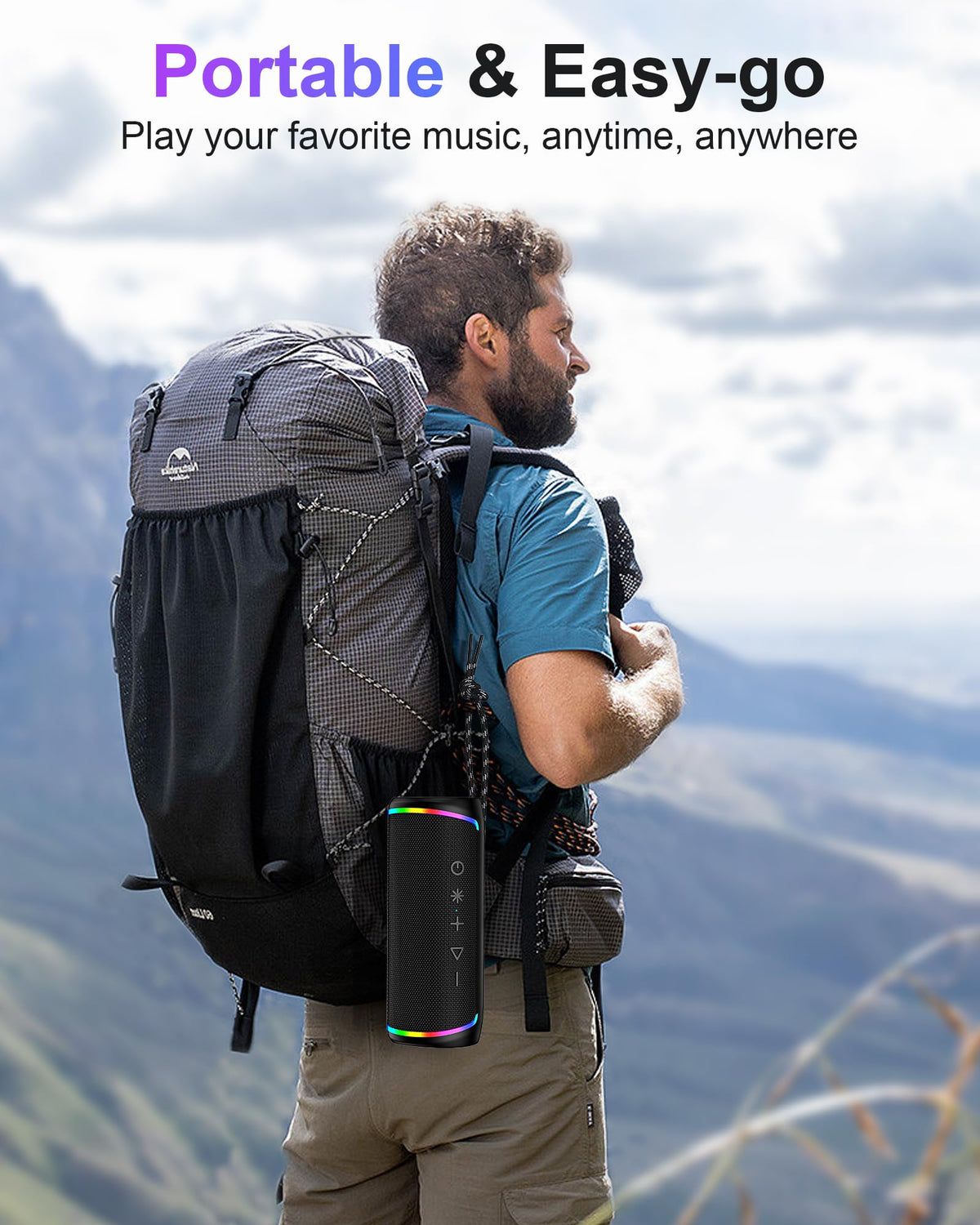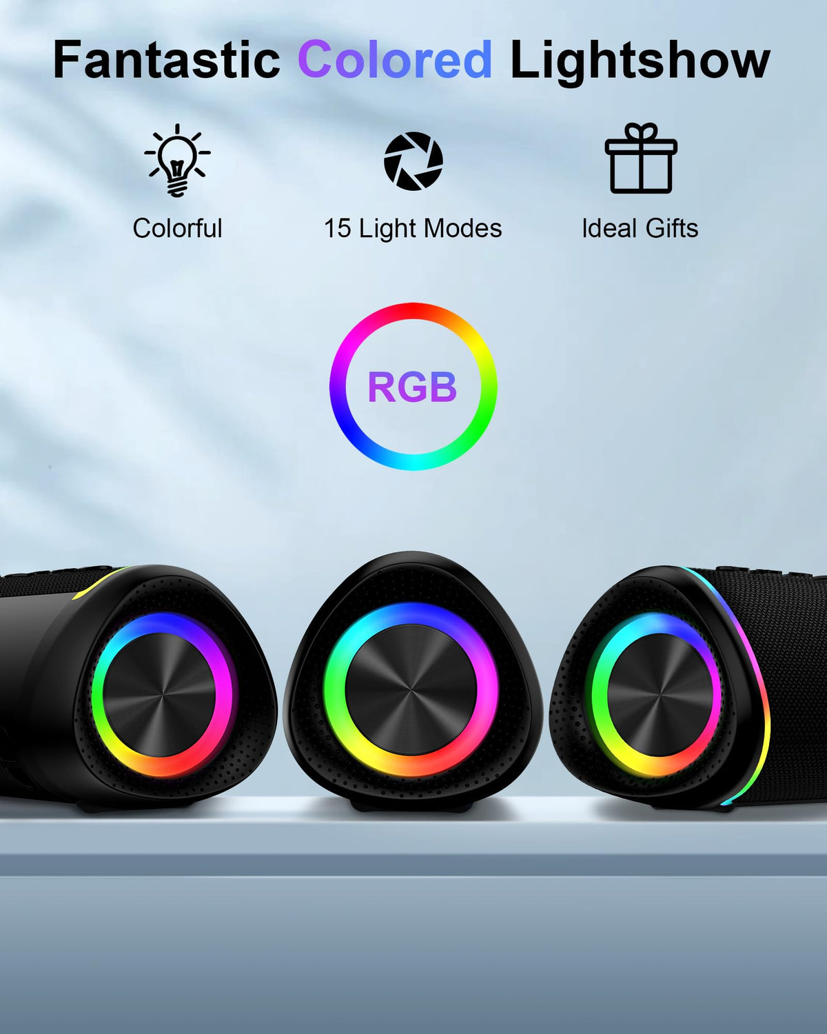 - Specifications For Travel Bluetooth Speaker - - Material: Abs Plastic + Iron Mesh; - Input Voltage: Dc 5V; - Output Power:16W(Max); - Bluetooth Version: 5.3; - Bluetooth Named: Ebs-609; - Battery Capacity: 1800Mah; - Playback Time: Up To 10 Hours; - Charging Time: 3 Hours; - Waterproof Rating: Ipx5; - Audio Distance: Barrier-Free 100Ft; - Signal-To-Noise Ratio: =85Db; - Led Light: 15 Light Modes; - Support: Bluetooth/ Tf Card/ Aux-In; - Dimensions:190Mm X80Mm X80Mm; - Weight: 630G [1.38Lb]; - Featuring For Mini Bluetooth Speaker With Mic - - Portable Bluetooth Speaker - Lightweight And Compact, With An External Hanging Rope, Can Be Taken By Hand Or Packed, Which Is Convenient To Carry Out. Perfect For Picnics, Camping, Or Travel. - Bluetooth 5.3 Connection - With The Latest Bluetooth 5.3 Technology, It Will Quickly Connect To Bluetooth-Enabled Devices Up To 100 Feet Away. - Hands-Free Calls - Built-In Microphone Allows You To Take Hands-Free Calls Directly Through The Speaker, Providing Convenience And Ease Of Use. - All-Round Protection - Meets Ipx5 Waterproof Standards, Its Resistant To Water Splashes From Any Direction, Making It Perfect For Outdoor Activities, Parties, Or By The Pool. - Packing List - - 1* Wireless Portable Speaker; - 1* Usb C Cable For Charging Bluetooth Speaker; - 1* User'S Manual;