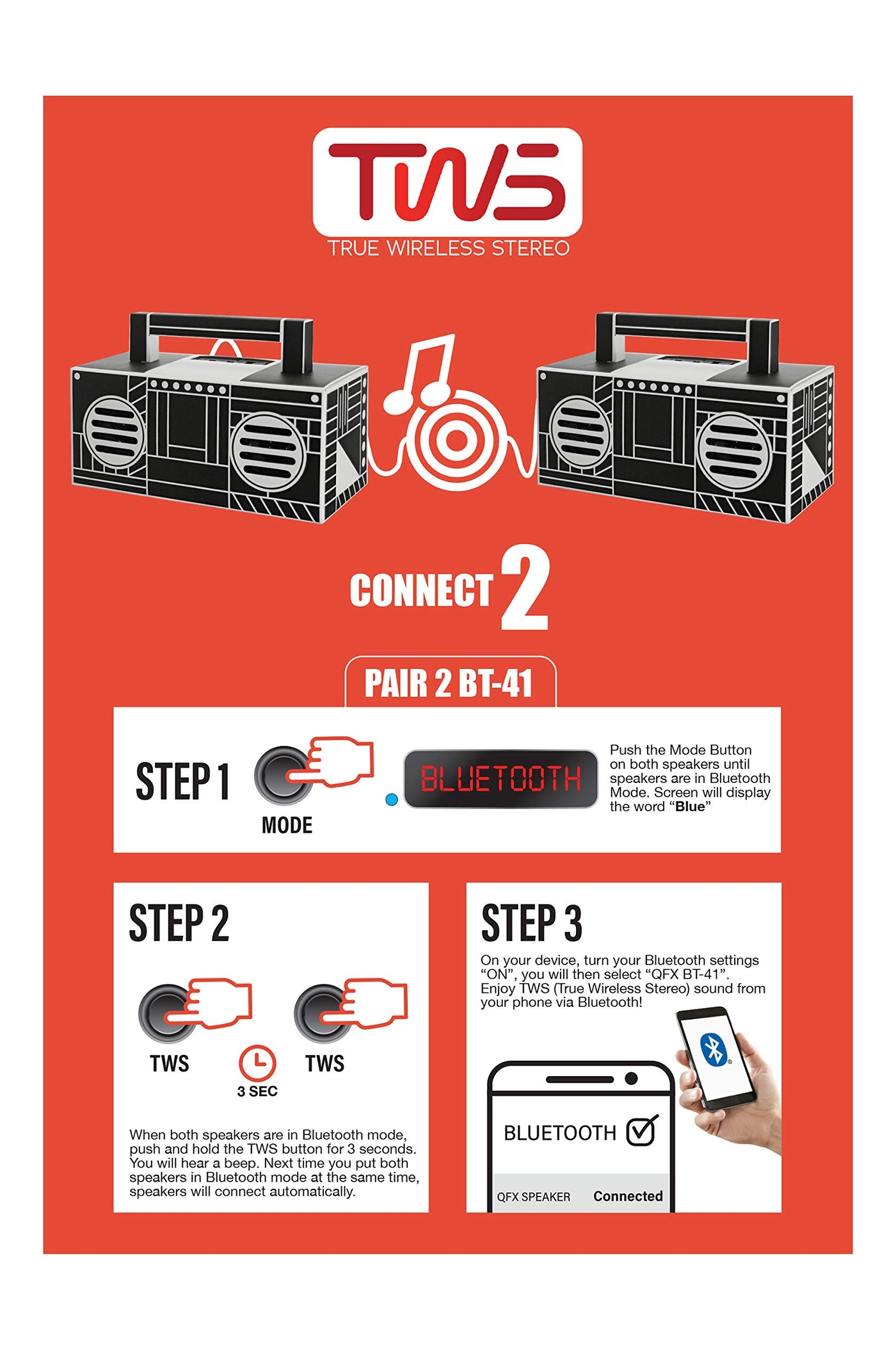 With Qfxs Bt-41 Portable Rechargeable Bluetooth Speaker, You Can Now Place And Receive Handsfree Calls From Your Bluetooth-Enabled Smartphone Over The Built-In Microphone, Or Effortlessly Play Music From Your Favorite Bluetooth Device, Usb/Tf Device, Or Fm Station, And Enjoy The Quality And Performance Youve Come To Expect From Qfx Brands. Qfx'S Tws (True Wireless System) Allows Two Tws Ready Speakers To Connect, Sync, And Play Bluetooth Audio Simultaneously For A True Stereo Sound. With Two Tws Ready Speakers And Your Bluetooth Enabled Device, Your Party Will Be Taken To The Next Level - It'S Not Just A Party Anymore - It'S An Event, With Rich, Powerful Stereo Sound! The Rechargeable Battery Delivers Untethered Freedom Of Placement. Included Dc 5V Usb Charge Port And Usb Cord Makes Charging Easy. Note: Tws Is A Bluetooth Only Feature And Will Not Work With Fm Radio Or Usb/Micro-Sd. Qfx Leads The Market In Lifestyle Consumer Electronics By Delivering Innovative Product Designs And Exceptional Performance To Value-Conscious Consumers Without Compromise. With Three Decades At The Frontline Of Quality Electronics, Qfx Stands Firm In Its Commitment To Offer The Latest In Bluetooth Audio, Tailgating And Dj Speaker Systems, Led T.V.S, And Many Other Prosumer Multimedia Solutions, Affording Budget-Focused Families, Businesses, And Everyone In Between, Industry-Leader Quality Without Breaking The Bank. From Freshman Dorm To Alumni Tailgate Party, From First Apartment To Family Home, Qfx Has The Gear You Need At The Price You Want!