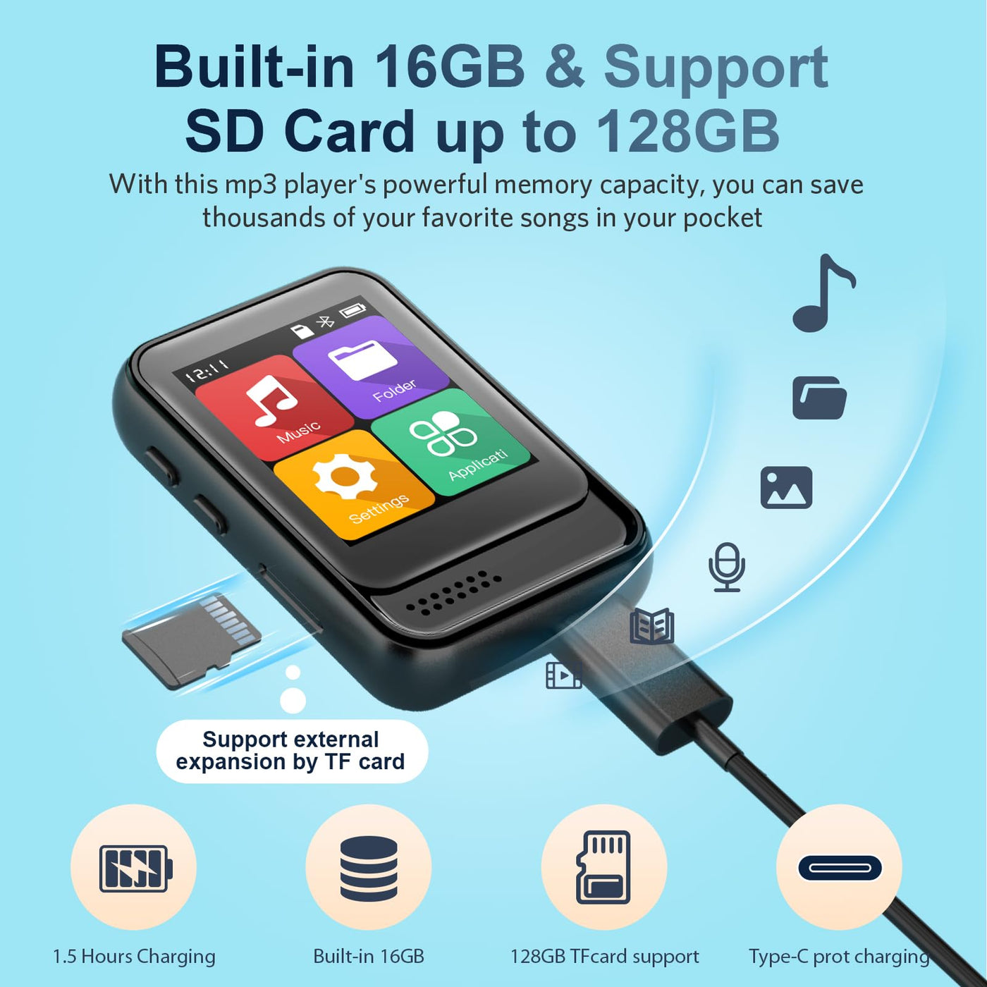 Parameters:Model No.: Qngee-M8Size:65 40 15Mm(2.56 1.57 0.59Inch)Weight:32G(1.13 Ounces)Brand: Qngeevideo Format: Amv /Aviebook Format: Txtlyric Format: Lrcpicture Format: Bmp, Jpgaudio Format:Mp3/ Wma/ Ape / Flac / Wav/ /Drm / Acelpmemory: Built-In 16Gb Support For Extended Memory Up To 128Gbsupported Operating System:Windows98/Window Xp/Vista/Window7/Window8/Window10Screen Size:1.8Inch Full Touch Screen&Nbsp;Usb Port: Usb Type-Cbluetooth Version:5.0Microphone: Built-In Dual Capacitor Microphonebattery Capacity:330 Mah 3.7Vcharging Time: 2~3 Hours(Use 5V/500Ma Charger For Charging Or Connect With Your Pc By Usb Cable For Charging.)Volume Adjustment: Level 31 Digital Volume Control Modescreen Brightness Adjustment: 00~11 (The Larger The Number, The Higher The Brightness)Variable Playback: -8~+8Languages: English, French, Italian, Dutch, Portuguese, Chinese, Japanese, Turkish, And Morefunction: Music/Video/Fm Radio/E-Book/Bluetooth/Picture/Folder/Voice Recording/Setting/Stopwatch/Calendar/Alarm.Headphone: Headphone Output Power: 10Mw@32?; 20Mw@16?, Support Headphones With Impedance 16Oor 32O