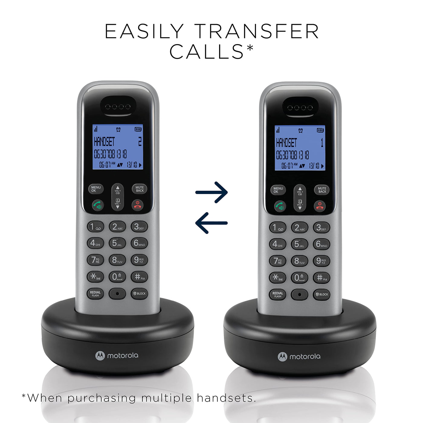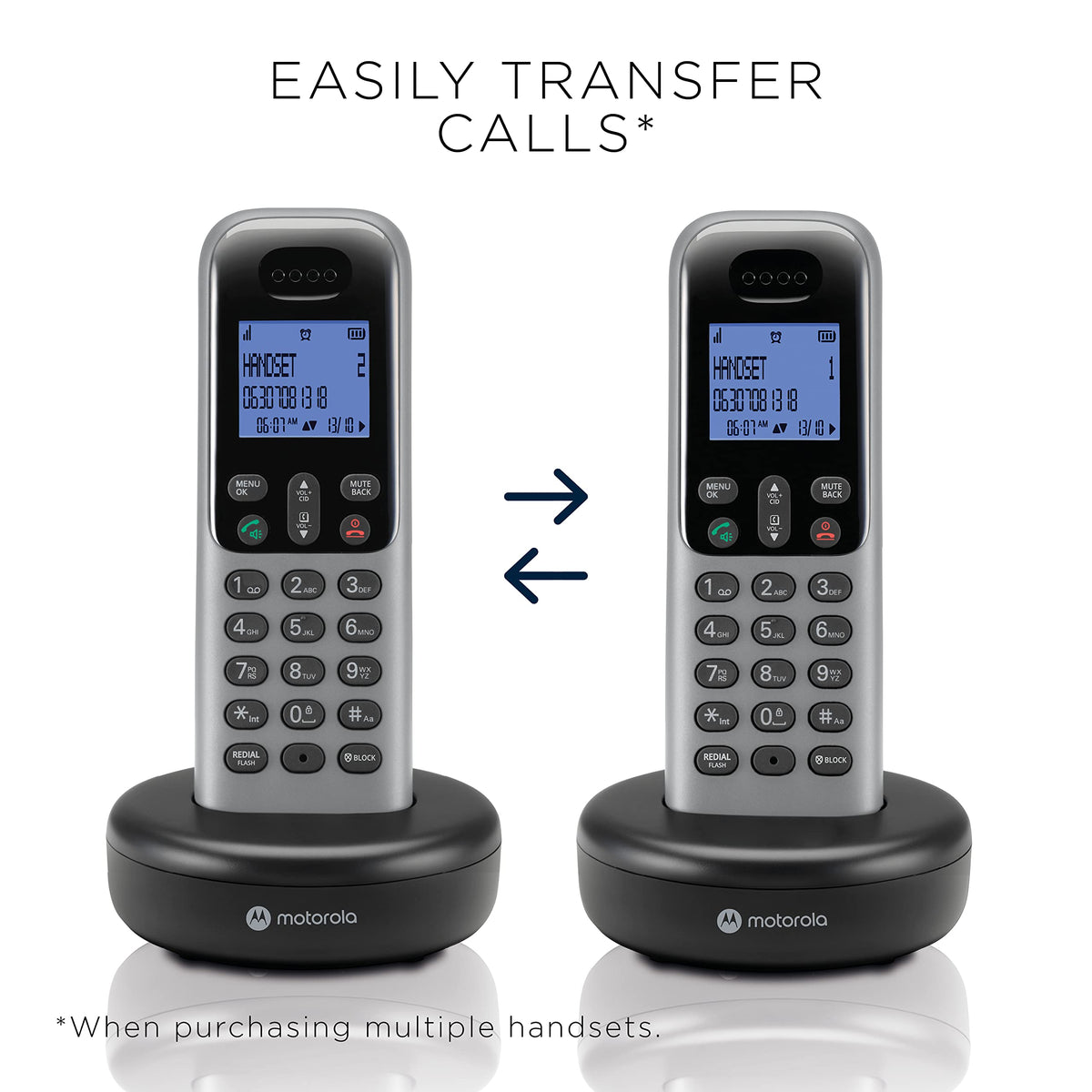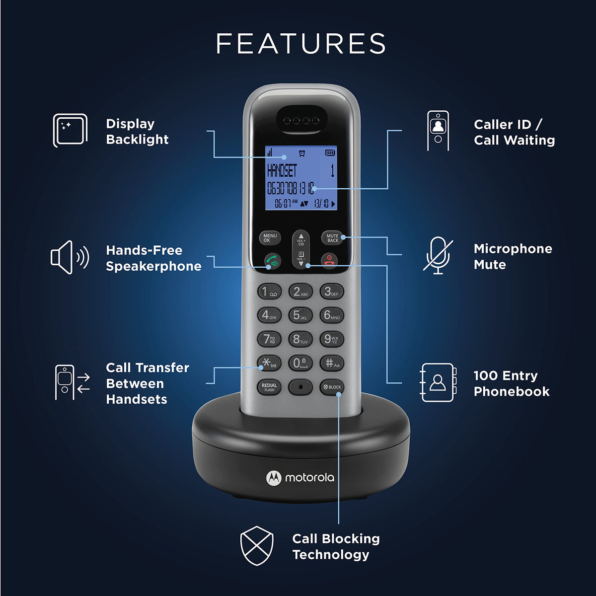 The Motorola Voice T600 Series Cordless Phone Features Hands-Free Speakerphone Capability And Caller Id So You Know Who'S Calling Before You Pick Up. Our Cordless Phone Includes A Backlit Display For Easy Readability. The Motorola Voice T600 Series Telephone System Is Expandable With Up To Four (4) Handsets And Is An Ideal Option For Home Or Office. When Two Handsets Are Present, The System Allows For 3-Way Conferencing Plus Simultaneous Intercom, As Well As Call Transfer Between Handsets. In Addition, The Cordless Phone'S Internal Phonebook Holds Up To 100 Names And Numbers. Our Digital Cordless Telephone With Microphone Mute Is The Perfect Option For Those With Landline Numbers At Home Or The Office.