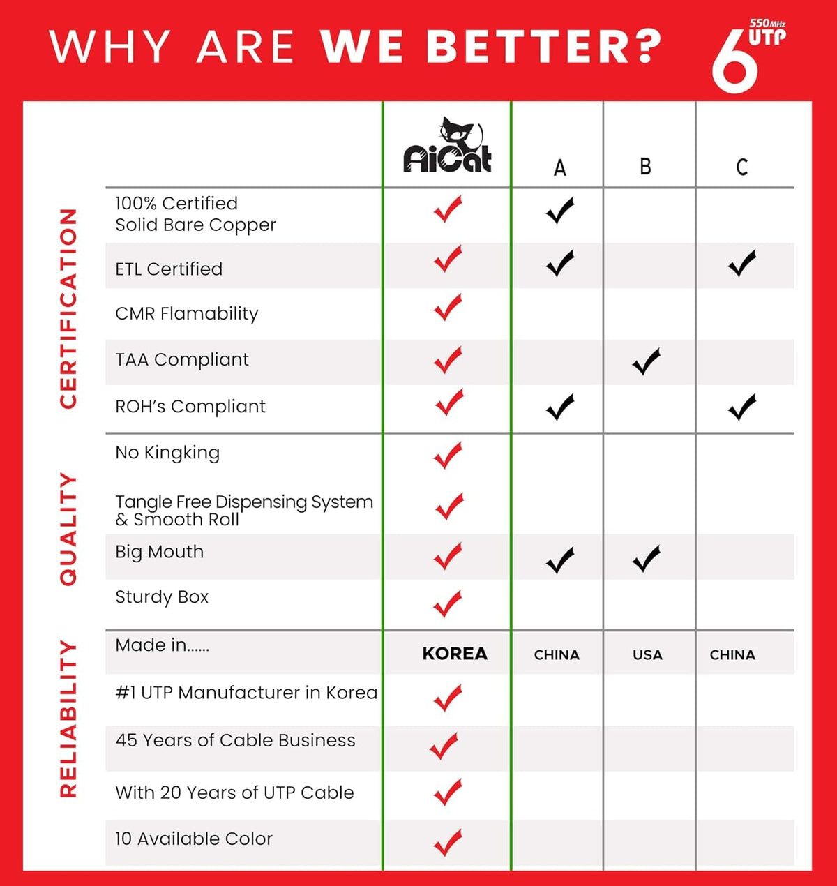 Q: How does the noise-reducing design of this cable affect performance?A: The AiCat Cat 6 Ethernet Cable features four twisted pairs with a PVC cross separator, which significantly reduces crosstalk and electromagnetic interference. This design ensures a clean, uninterrupted connection, enhancing the overall performance of your network.