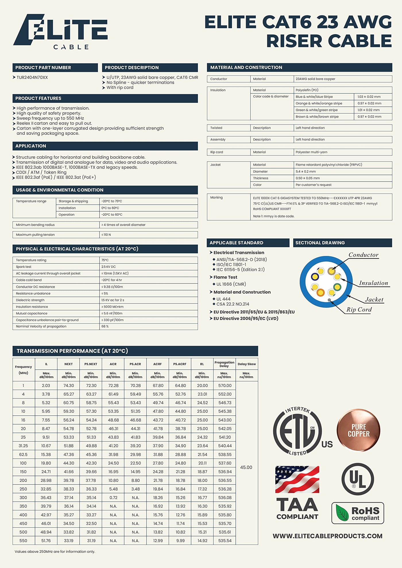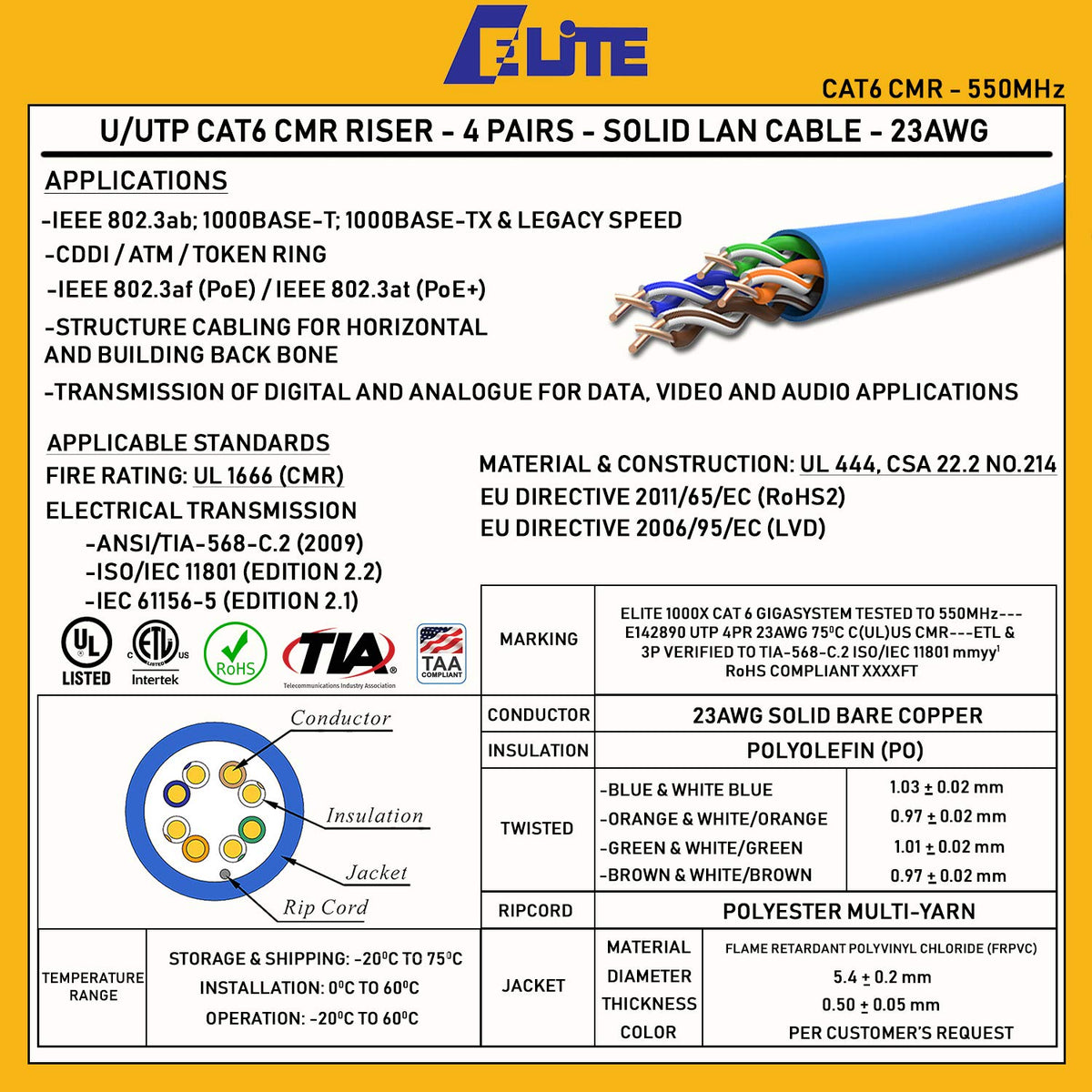 Product Description Elite Cable Cat6 Riser (Cmr) Bulk Cable Is Designed With Headroom For Tomorrow'S Emerging High Speed Lan Technologies. Cat6 Cmr Bulk (Lan) Cables Are Perfect For Gigabit Ethernet, Atm, Broadband Video And Poe. This Cmr Rated Cable Is To Be Installed In Non Plenum Areas, The Walls And Can Be Placed In Between The Floors. Elite Cat6 Riser Is Constructed Above Standards That Will Make Any Project Successful. The Features Are Top Of The Line Performance Boasting A High Performance Of Transmission Frequencies Up To 550Mhz. This Cat6 Riser Cable Is Built Without A Spline For When Greater Flexibility Is Needed. Elite Cable Has Included More Insulation Around The Wires To Give You The Performance You Want Against Near End Crosstalk. The Advanced Designed Box Has The Strength To Hold Up In Any Condition And Makes Pulling A Breeze. On Top Of That The Reelex Ii Box Is Eco-Friendly And Is 100% Recyclable. The Structure Is Perfectly Assembled To Master Any Project And Configure For Horizontal And Buildings Backbone. Quality Comes First With Elite Cat6 Riser Cable So You Know What You Are Getting Is Truly A Step Ahead. 100% Pure Copper For Greater Performance And Exceeds Cat6 Industry Standards. All One Thousand Feet Of The Jacket Is Marked Every 2 Feet So You Know How Much Length Is Left. Pair This Cable With Cat6 Unshielded Connectors For A Network Your Home Or Business Has Always Wanted.