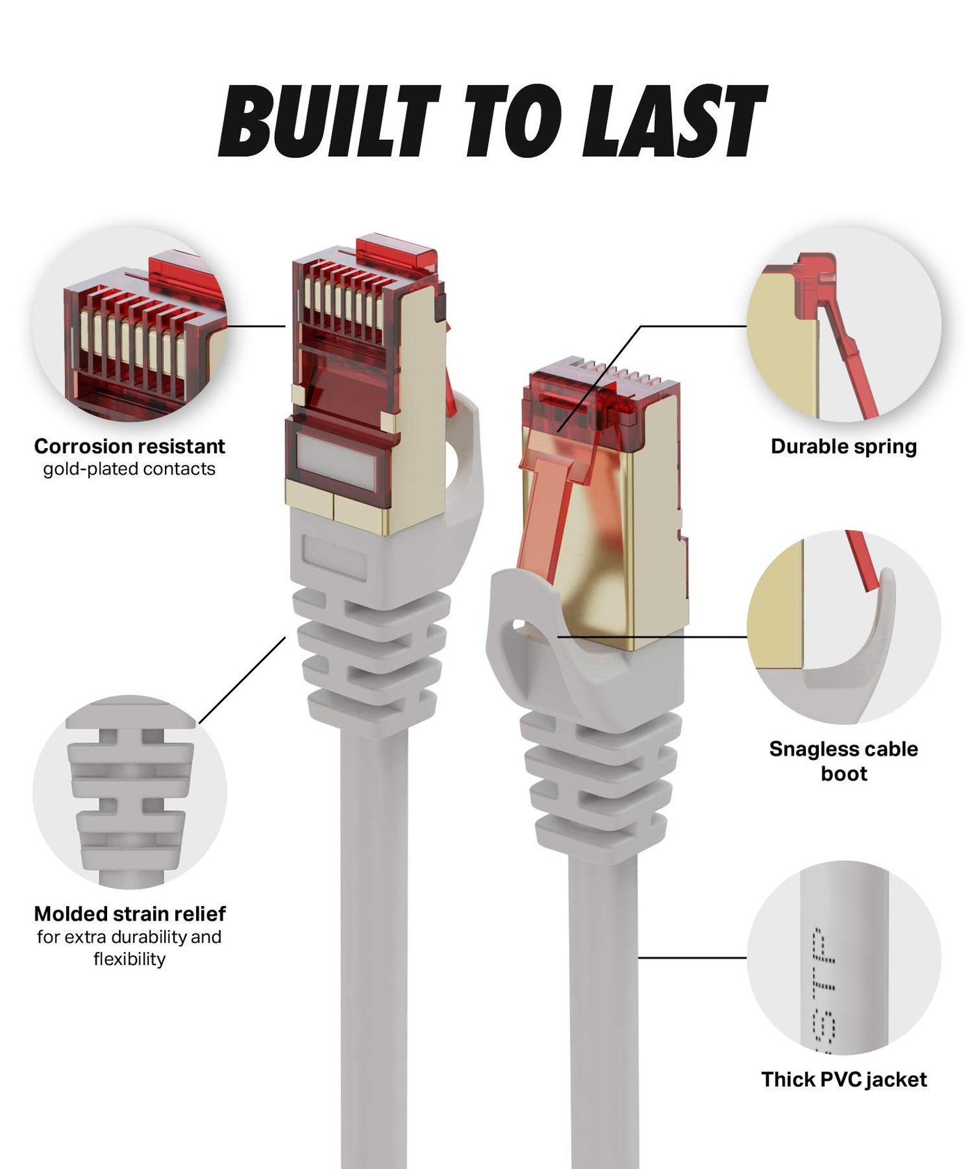 Q: What makes this Cat7 Ethernet cable suitable for high-speed networks?A: This cable is double shielded with STP (Shielded Twisted Pair) technology, which minimizes crosstalk and interference, ensuring exceptional transmission performance at high frequencies up to 600MHz.