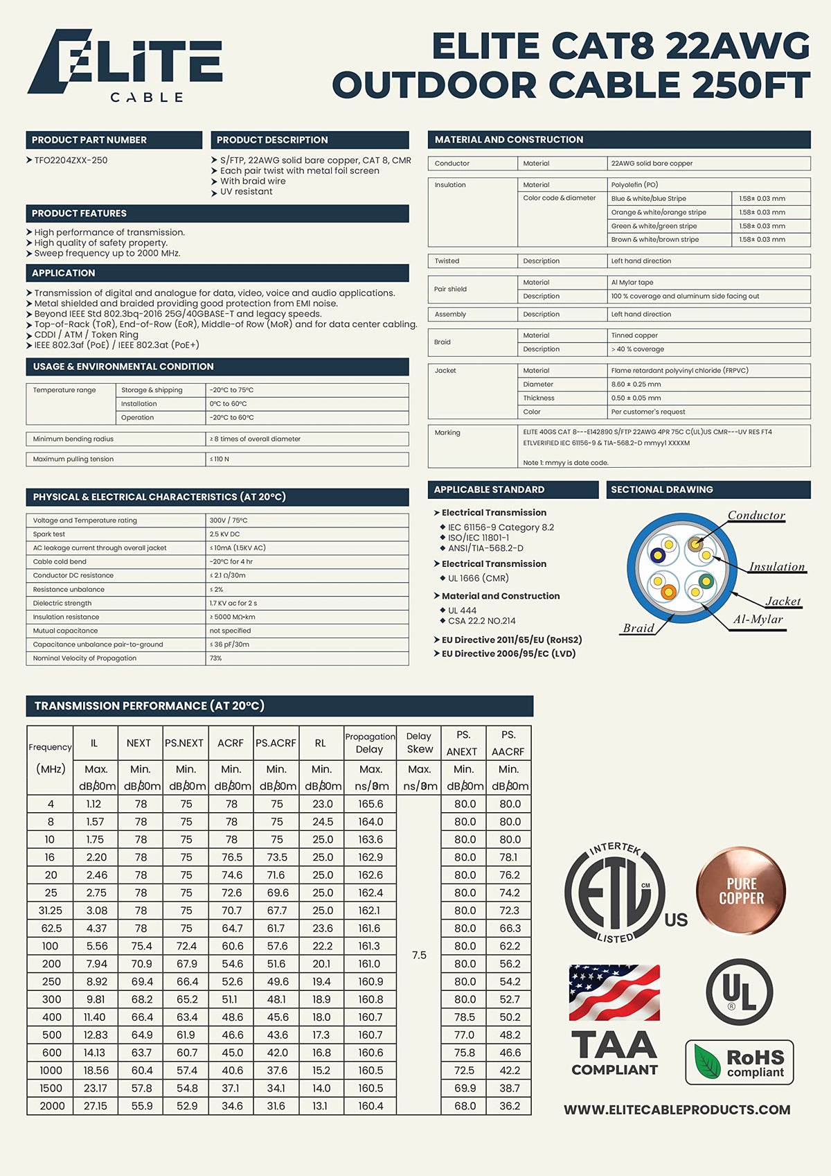 State-Of-The-Art Technology: As The World'S First Cat8 Outdoor/Indoor Cable, You'Ll Be At The Forefront Of Technology With This Product. Elite Cable Is Based In California With A Priority In Creating High Quality Products With Transparency And Certifications You Can Trust. | Outdoor / Indoor Rated | Suitable For Both Outdoor And Indoor Installations, Eliminating The Need For Extra Cable Inventory. | Uv And Cmr | Our Cat8 Outdoor Cable Durable Construction Is Uv Resistant For Outdoor Use And Cmr Rated For In-Wall Installation, Ensuring Longevity And Reliability. | High-Speed Capabilities | Cat8 Cable Is Rated For Speeds Up To 2000Mhz And 40Gb, Providing Future-Proofing For Your Network. | Enhanced Shielding: 22Awg And Double Shielded Construction For Improved Signal Quality And Interference Reduction.