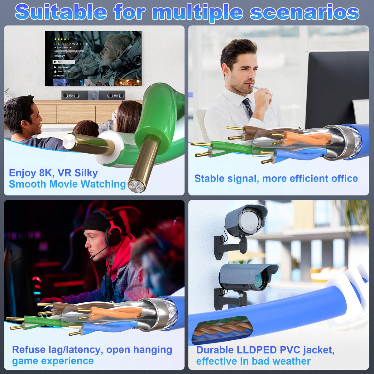 Cat 7 High Speed Ethernet Cable Provides Maximum Network Speeds Of 10Gbps, 10 Times Faster Than Cat 6 Cables For The Future Of 10Gbps Networks In The Home. The Stable, Fast Connection Lets You Surf The Web, Stream Video, Music And Other Data Transfers Without The Hassle Of Slow Internet Speeds, Enhancing Your Online Gaming And Office Experience. High-Speed 10Gbps Network Adapts To The 5G Network Era 10Gbps High-Speed Transmission And 600Mhz High-Bandwidth Are Suitable For 5G Network Construction, Enabling You To Better Experience The Era Of Ai. Sftp Triple Shield Cat 7 Cables Have Sftp Triple Premium Aluminum Foil Shielding On Each Twisted Pair. Whether It'S A Home High-Speed Intranet, Smart Home, Gaming, Online Office And Other Networking Environments, Or If There Is A Need For Shielding For Outdoor Installations, It Provides Better Protection Against Crosstalk, Noise And Interference That Can Degrade Signal Quality. Ruggedized, High-Quality Pvc Outer Jacket The Cat 7 Cable Jacket Is Made Of High Quality Pvc Material, Which Is Rugged And Long-Lasting. Provides A Secure, Waterproof, Uv-Resistant, Corrosion-Free Connection Outdoor / Indoor. Maximizes The Protection Of The Cable'S Conductor Core Against Breakage Or Bursting. This Greatly Reduces The Frequency Of Purchasing New Network Cables, Reducing The Cost Of Purchase And Selection Effort For You. Heavy Duty Cat 7 Ethernet Cable Durable, Flexible, Waterproof, Corrosion-Resistant Cables For Heavy-Duty Work, Suitable For Outdoor / Indoor Use, And Can Be Buried Directly In The Ground. High Network Compatibility Cat 7 Is Backward Compatible With Cat5, Cat5E And Cat6, Cat6A Legacy Network Cables. Provides Universal Connectivity To Computers And Network Components Connects Multiple Devices Such As Routers, Smart Tvs, Computers, Network Printers, Game Boxes, Network Adapters, Hubs, Switches, Routers, Dsl/Cable Modems, Patch Panels, Etc. Via Its Own Rj 45 Connector. Please Note The 24Awg Cat 7 Conductor Core Is Copper Clad Aluminum And Is Not Recommended For Use As Poe Power Supply.