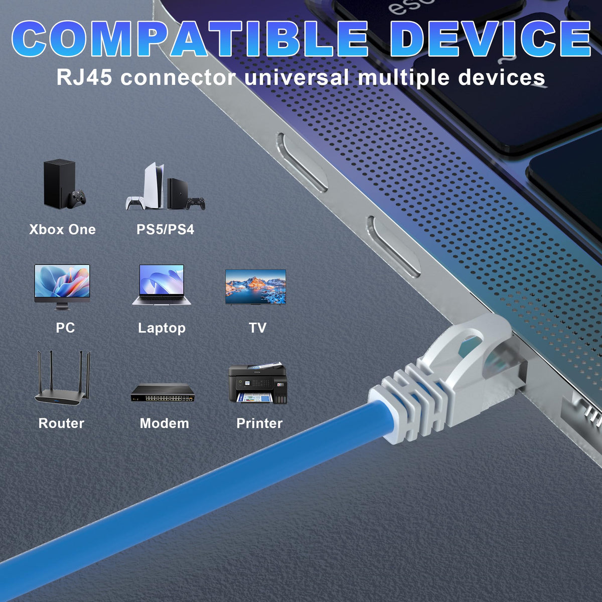 Q: What types of devices can be connected using this Ethernet cable?A: This Cat 7 Ethernet cable can connect multiple devices such as routers, smart TVs, computers, gaming consoles, network printers, and switches through its RJ45 connectors, providing universal connectivity for various networking needs.