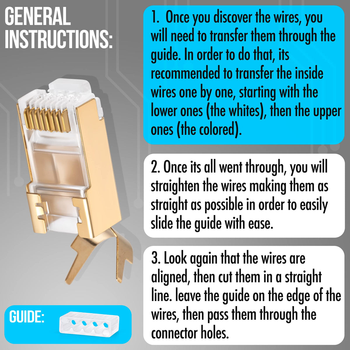 Tired Of Constantly Replacing Corroded And Faulty Rj45 Connectors? You Have Availed Of The Fastest Internet Connection Service Offered So You Can Watch All Your Favorite Shows And Play Online Games Without Lag Or Drops. Despite This, You Still Experience Data Interruptions Or Poor Connections - All Brought About By A Rusty And Damaged Ethernet Connector. If You Are Looking To Make The Most Out Of Your Lightning-Fast Internet Plan, You Have To Ditch Ordinary Rj45 Plugs. What You Want Is A Plug That Easily Resists Moisture, Rust, And Corrosion. Solve Your Ethernet Plug Frustrations By Choosing A Gold Plated Cat7/6A Ftp/Stp Connector. Our Ethernet Cable Plug Shows Off A Pass Through Feature, Which Allows You To View And Check The Order Of Your Cable Before You Crimp The Wire. This Saves You Time And Effort, As It Minimizes Wire-Crimping Errors And Mistakes. This Cat7/6A Connector Features 8P8C Ftp Shielding, Which Promises Improved Data Transmission And Better Signal Strength When Compared To Unshielded Plugs. If You Are Using Ordinary Ethernet Plugs, These Can Easily Get Rusty Over Time, Especially When They Get Exposed To Moisture And Humidity. Our Gold-Plated Connectors Last Longer Against Corrosion, So You Never Have To Keep Regularly Replacing Plugs. General Instructions: 1. Once You Discover The Wires, You Will Need To Transfer Them Through The Guide. In Order To Do That, Its Recommended To Transfer The Inside Wires One By One, Starting With The Lower Ones (The Whites), Then The Upper Ones (The Colored)2. Once Its All Went Through, You Will Straighten The Wires, Making Them As Straight As Possible In Order To Easily Slide The Guide With Ease.3. Look Again That The Wire Are Aligned, Than Cutting Them In A Straight Line, Leave The Guide On The Edge Of The Wires, Then Pass Them Through The Connector Holes.