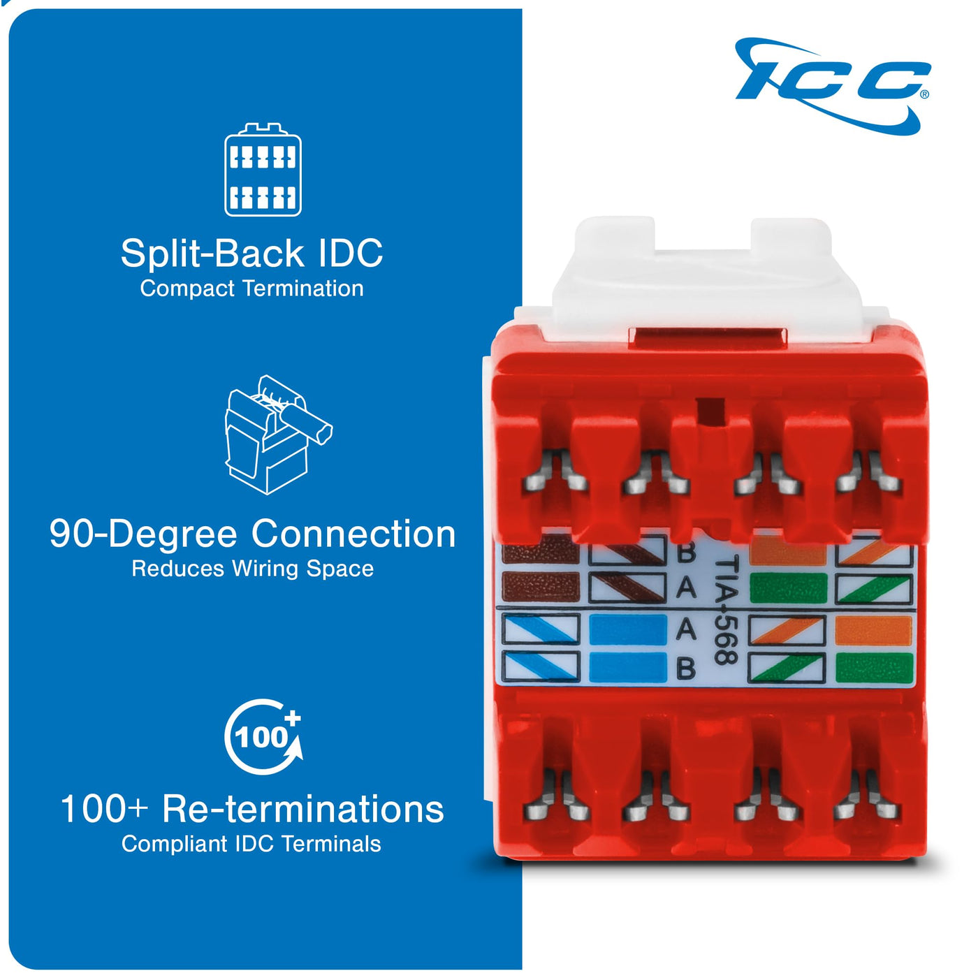 CAT6 High Density (HD) Category 6 modular jacks, RJ-45 keystone jacks, is 8-position 8-conductor (8P8C) is engineered to provide superior performance and reliability, supporting Gigabit Ethernet applications and beyond. The advanced printed circuit board design is tuned to provide optimum signal quality with maximum headroom, allowing it to exceed TIA/EIA Category 6 performance standards. It offers superior signal quality and noise reduction due to its enhanced Near-End and Far-End Crosstalk cancellation and minimum return losses. The Category 6 HD design offers a smaller rear footprint maximizing space in confined work areas. Features CAT6 rated connectors provide excellent performance for data networks. PCB technology provides maximum performance and superior signal quality. Enhanced crosstalk cancellation reduces return loss and improves performance by rejecting noise and unwanted signals. Exceeds ANSI/TIA-568-C.2 Category 6 connecting hardware requirements. Designed with rear split back 110 IDC reducing termination time. Terminate with 110 punch down tool or JackEasy Termination Tool. Reduced rear footprint allows for greater connectivity density. Provides for more port configurations in a smaller area. Includes an integrated TIA-568A/B color wiring diagram. Backward compatible with all lower rated category components. Works with all Work Area Outlets faceplates, inserts, surface mount boxes. Used with Category 6 patch cords. Exceeds ANSI/TIA-568-C requirements for permanent performances. UL 1863 Compliant.