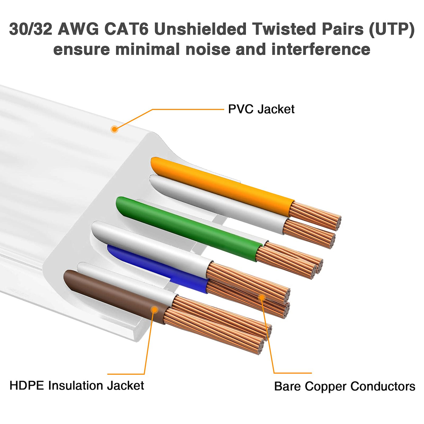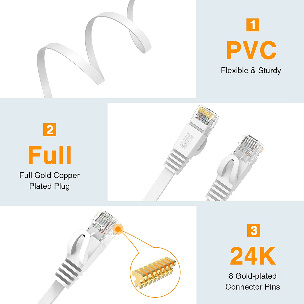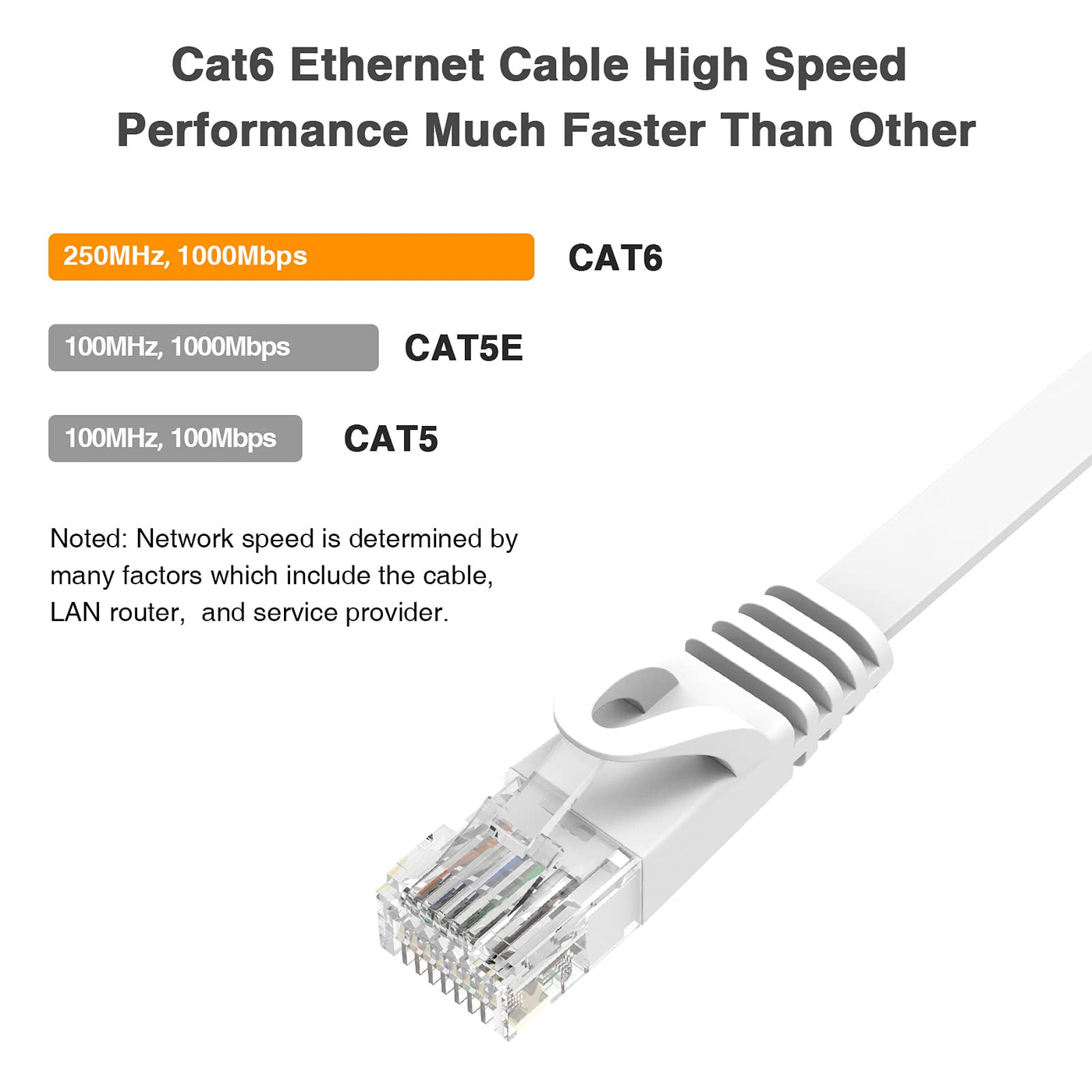 Cat6 Snagless Network Patch Cable Maintain Stable Transmission Speed And Barrier Free Network Transmission, It Supports Up To 250 Mhz And Is Suitable For Fast Ethernet, Gigabit Ethernet, And 10-Gigabit Ethernet Ultra Thin And Flat To Beautify Your House, Flexible Cat 6 Ethernet Cable Can Be Free To Walk In The Corner Of The Home, Easily Hidden In Carpets, The Corner Of The Door, Walls, Or Even Behind Furniture High Speed And Reliable Connectivity. Cat6 Flat Ethernet Cable Is Capable Of Transmitting Data At Speeds Of Up To 1.0Gbps Over 100M Run Of Cable,The Cat 6 Wires Provides Better Immunity From Crosstalk, Noise, And Interference That Can Degrade The Signal Quality It Applies To A Lot Of Places, Such As Offices, Homes,Hotel And Internet Cafes, Rj45 Connectors Is Fully Compatible To Computers And Network Components, Such As Desktops, Laptops, Routers, Switches, Smart Tv, Tv Box, Ect