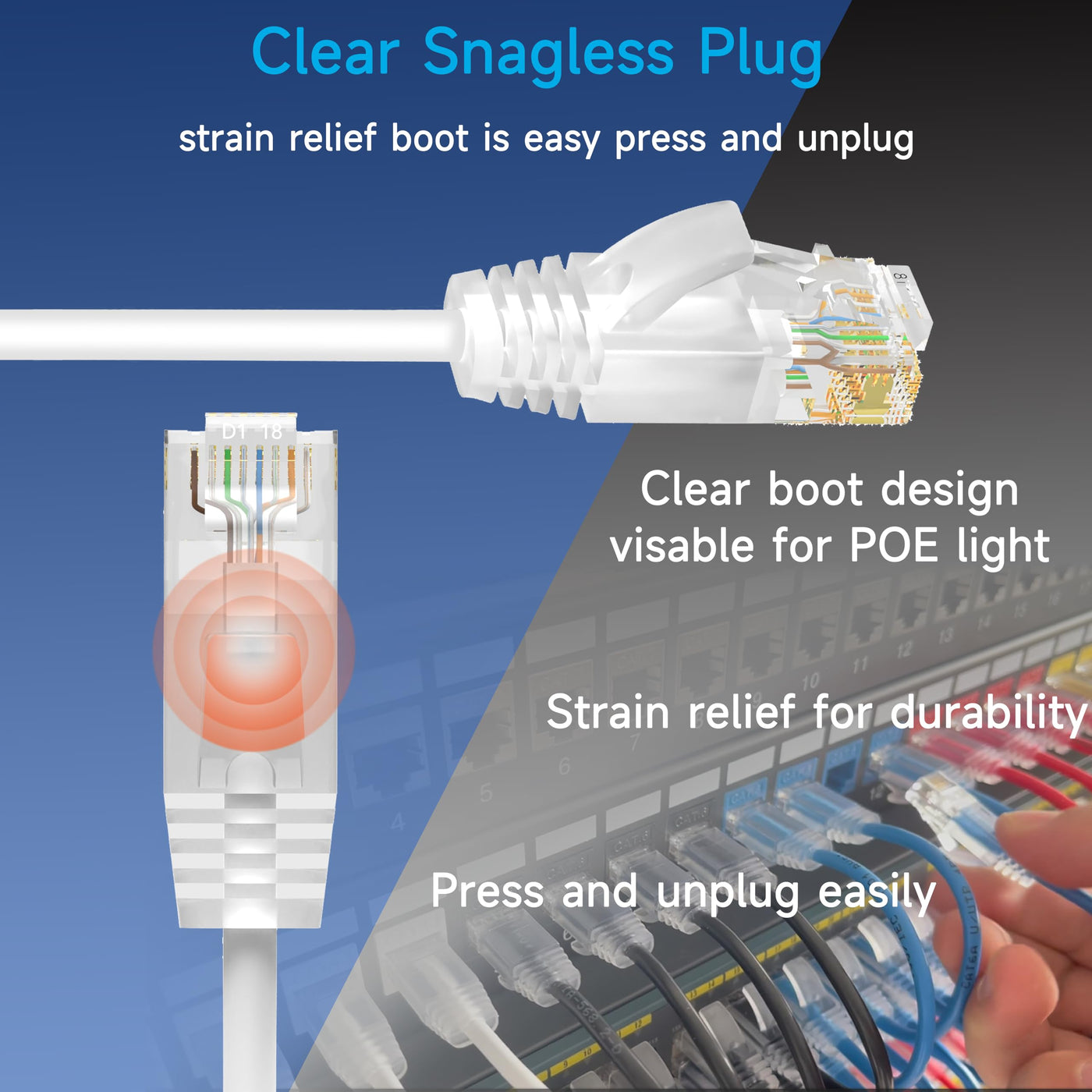 ?10G Transmission?--Cat6 Cables Are Made Of 28Awg Stranded Bare Copper With Reliable Performance And Durability. Patch Cable Cat6 Is Ideal For High-Speed Applications Up To 10 Gbps And Fluke Pass. Cat6 Ethernet Patch Cables Exceed The Ansi/Tia-568.2-D Standard. ?Extremly Slim?--Thin Cat6 Patch Cables Are Over 50% Thinner Than Standard Cat 6 Patch Cables Outter Diameters, Make It Flexiable To Rout Network Devices In Tight Space. Ethernet Cable 1 Ft Is Also Benefit For Efficient Rack Airflow And High Density Installation And Management. ?Clear Snagless Plug?--Network Patch Cables Are Made Of Clear Tap Snagless Plug With Strain Relief Boot For Maximum Durability. Cat6 Patch Cords With Snagless Plug Is Easy Press And Unplug. Clear Boot Of Slim Cat6 Patch Cable Allows To See The Light Of The Poe Ports Easily. ?Poe/Poe+?--Copper Slim Ethernet Cables 28Awg Could Be Used For Poe 30 Watt And 60 Watt Applications With A Bundle Restriction Of Up To 12 Cables. ?Perfect For Short Patching?-- Maximum Length Of 28Awg Patch Cables Can Not Exceed 15 Meters. The Thinner Slim Cat6 Patch Cable Make No Difference Compared To The Standard Cat 6 Patch Cords In Short Network Connection. ?Widely Use?--Slim Cat6 Ethernet Cables Of The 6 Inch Length Are Typically Used In Server/Network Rooms For Plugging Between Patch Panels. Could Also Used For Connecting Modem To A Router, Switch, Server In The Home Lab Or Office Network.
