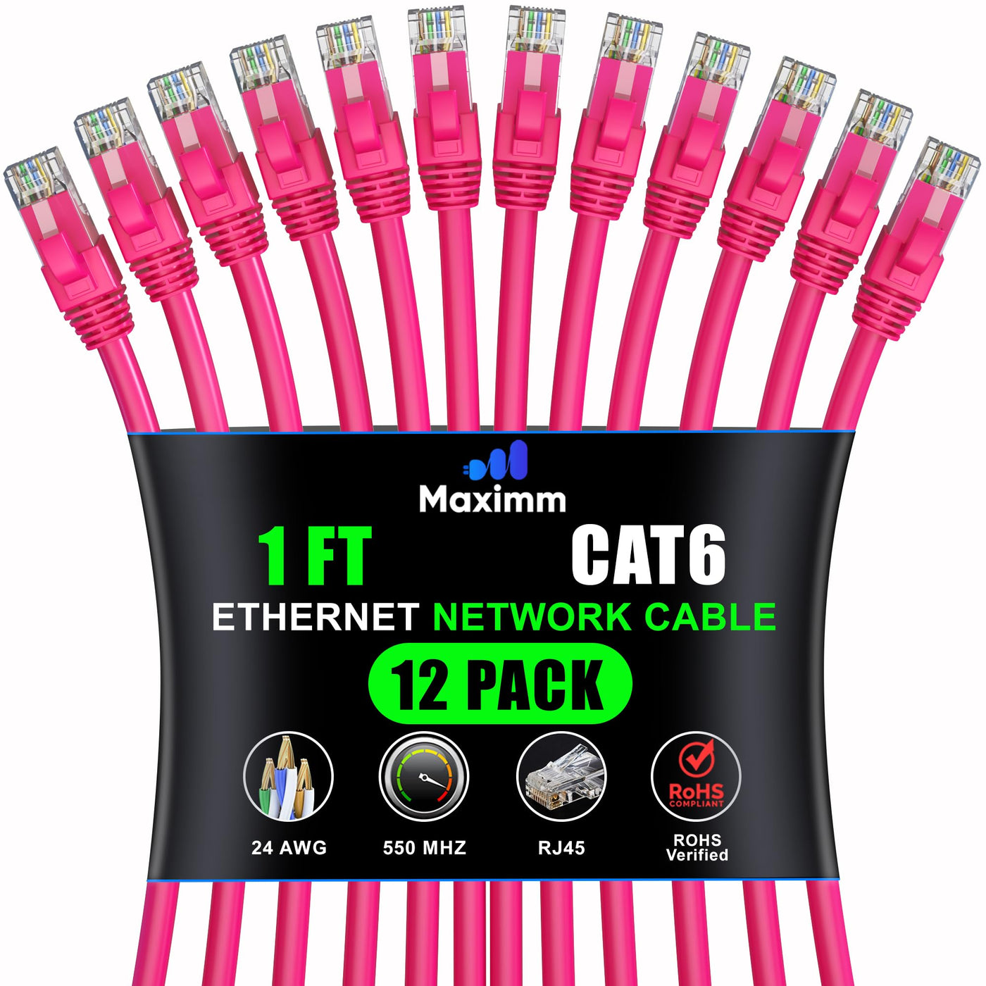 Maximm Cat 6 Ethernet Cable 1 Ft (12 Pack) High Speed Lan Cable, Internet Cable, Patch Cable, And Network Cable Utp, 10Gbps, 550Mhz Ethernet Cord Pink