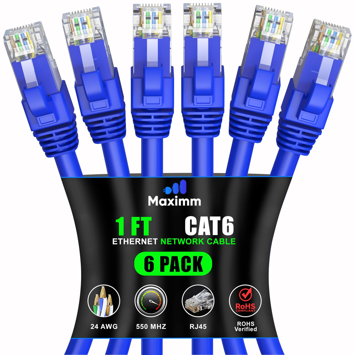 Maximm Cat 6 Ethernet Cable 1 Ft (6 Pack) High Speed Lan Cable, Internet Cable, Patch Cable, And Network Cable Utp, 10Gbps, 550Mhz Ethernet Cord Blue