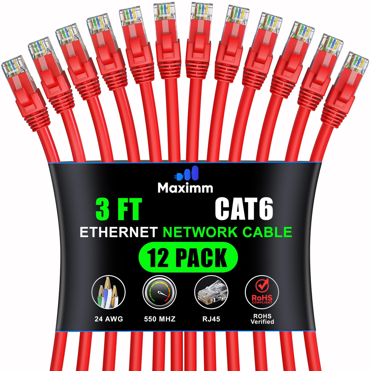 Maximm Cat 6 Ethernet Cable 3 Ft (12 Pack) High Speed Lan Cable, Internet Cable, Patch Cable, And Network Cable Utp, 10Gbps, 550Mhz Ethernet Cord Red
