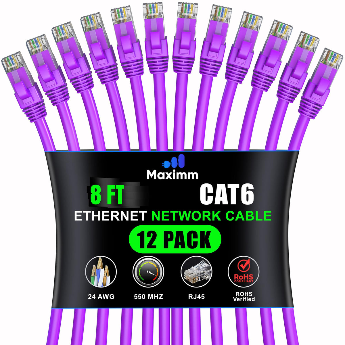 Maximm Cat 6 Ethernet Cable 8 Ft (12 Pack) High Speed Lan Cable, Internet Cable, Patch Cable, And Network Cable Utp, 10Gbps, 550Mhz Ethernet Cord Purple