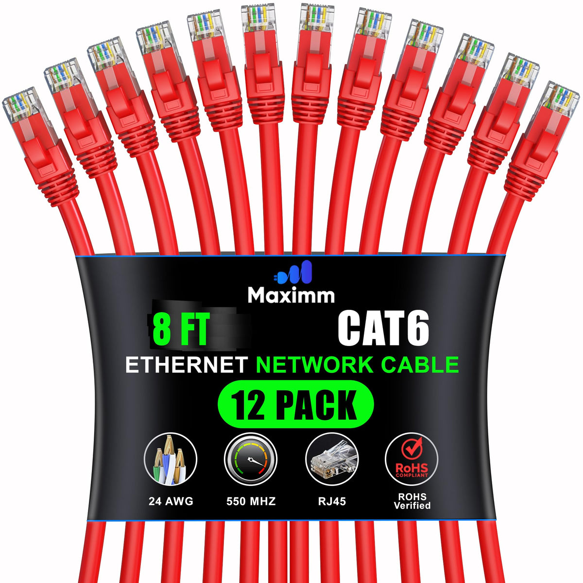 Maximm Cat 6 Ethernet Cable 8 Ft (12 Pack) High Speed Lan Cable, Internet Cable, Patch Cable, And Network Cable Utp, 10Gbps, 550Mhz Ethernet Cord Red