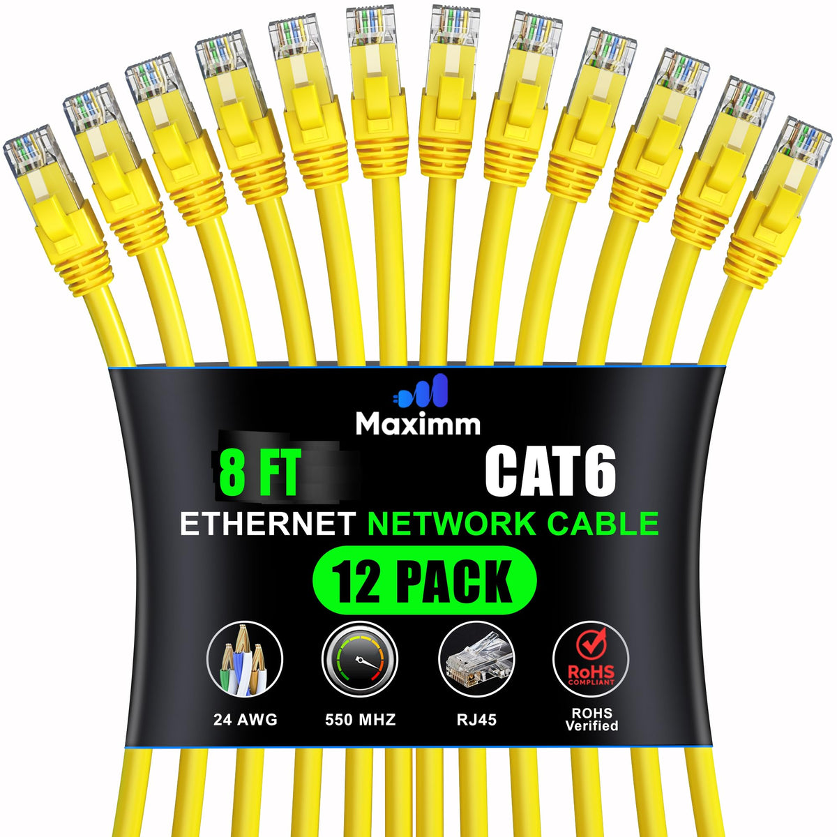 Maximm Cat 6 Ethernet Cable 8 Ft (12 Pack) High Speed Lan Cable, Internet Cable, Patch Cable, And Network Cable Utp, 10Gbps, 550Mhz Ethernet Cord Yellow