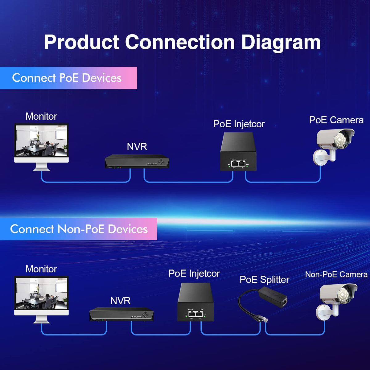 Q: What is a PoE injector and how does it work?A: A PoE (Power over Ethernet) injector is a device that adds power to an Ethernet connection, allowing a single cable to transmit both data and power to compatible devices like IP cameras or access points. It works by taking a non-PoE signal and injecting power into the Ethernet cable, enabling devices to operate without needing a separate power source.