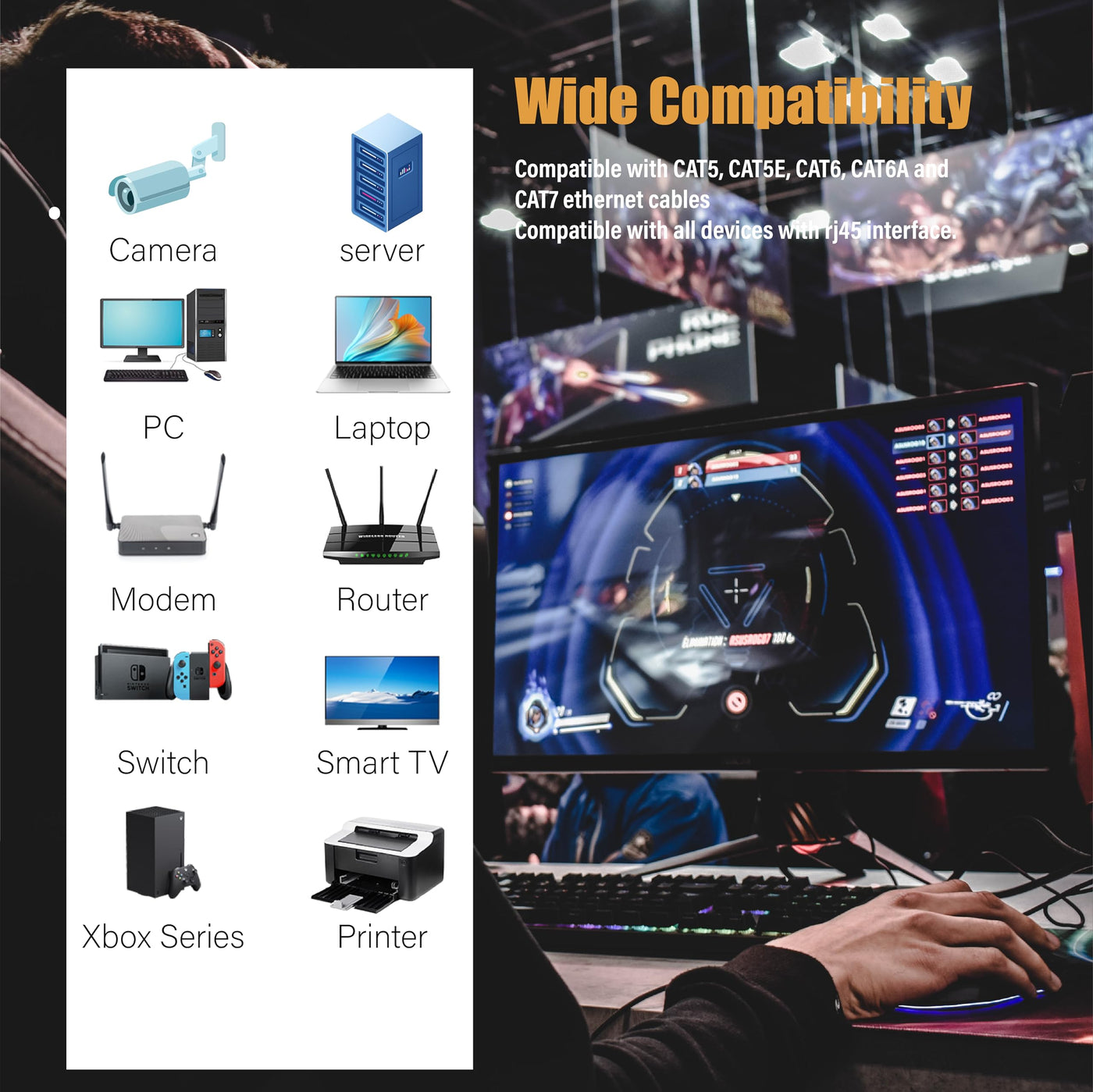 Q: What type of devices can I connect with the Cat 8 Ethernet Cable?A: The Cat 8 Ethernet Cable can connect various devices such as routers, switches, gaming consoles (PS3, PS4, PS5), laptops, smart TVs, and more, all equipped with RJ45 connectors.