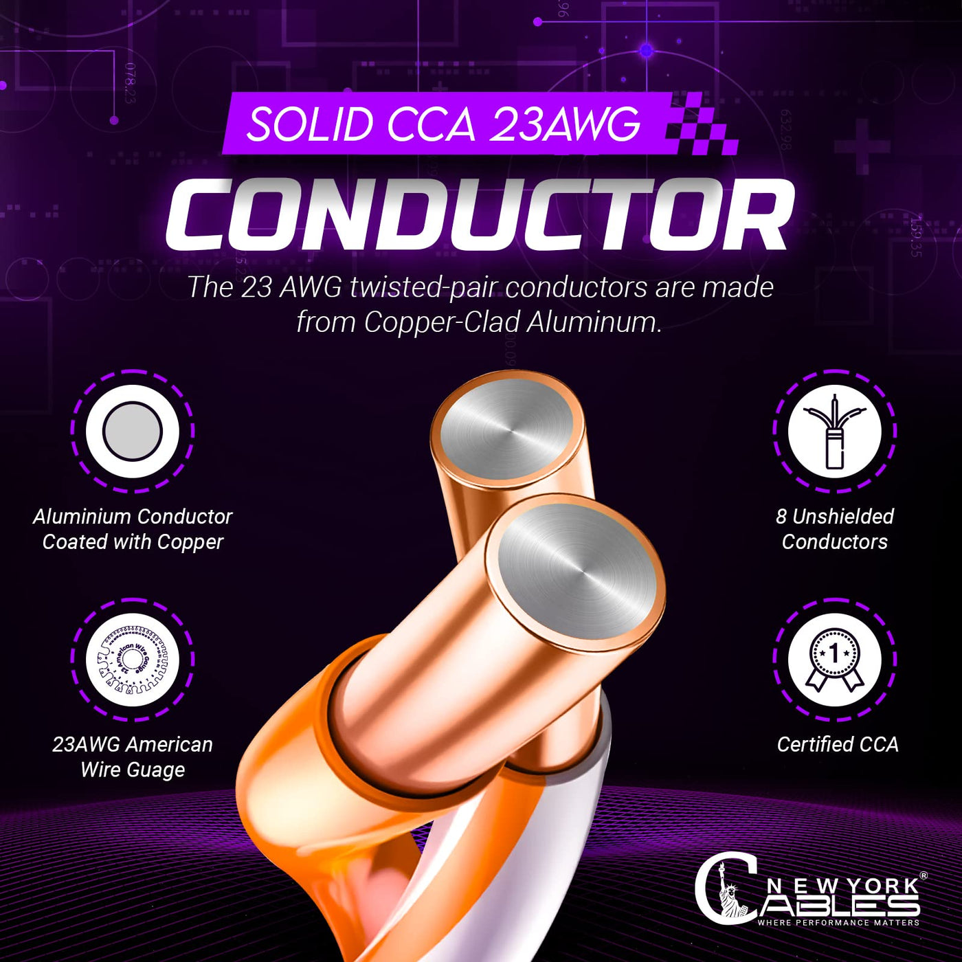 Q: What type of conductors does the NewYork Cables Cat 6 Cable use?A: This cable features 4 pairs of solid 23 AWG copper-clad aluminum conductors, ensuring efficient data transfer and excellent signal integrity.
