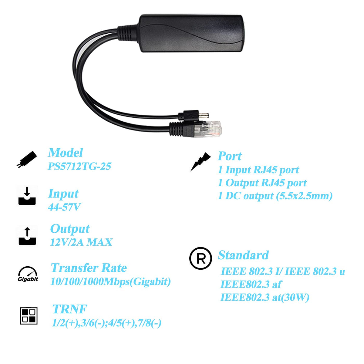 Overview:Poe Splitter Is An Economical And Practical Poe Remote Power Equipment Base On Ieee802.3Af & Ieee802.3At Standard.It Can Separate The Power And Data Via Cable Transmission And Proper Matching Use With Poe Switch Or Pse Injector Which Meet Standard Ieee802.3Af/At, Provides Power And Data At The Same Time For The Terminal Device Does Not Support Poe.Poe Splitter, Output Voltage Of 12V Use With The Power Supply Equipment, It Helps To Expand Wireless City, Security Monitoring And Other Poe Practical Place, And Is Not Restricted By Layout Of Power Line.Specifications:Support International Standard Ieee802.3 Af/At(30W);Poe Port Support 10/100/1000Mbps Data Transmissionpd Support 44V - 57V Voltage Transmission, Automatically Detects Power Supply From Pse Power Supply Module12V 2A Power Output, Easy To Access Poe Network For Non-Poe Terminalsupport The Isolation Circuit Protection, Can Effectively Protect Electrical Equipment.Support The Short Circuit, Overvoltage Protection1500V High Voltage Isolationmodel: Ps5712Tg-25Transfer Rate: 10/100/1000Mbps(Gigabit)Power: Input 48V Dc /0.6A, Output 12V/2Astandard: Ieee802.3 Af/Ieee802.3 At(30W)Trnf: 1/2(+),3/6(-);4/5(+),7/8(-)Interface Type: 1 Input Rj45 Port, 1 Output Rj45 Port, 1 Dc Output(5.5X2.5Mm)Standard: Ieee 802.3 I, Ieee 802.3 U, Ieee 802.3 X, Ieee 802.3 Af, Ieee 802.3 Atled: Yellow Poe Lamptemperature: Work Within -20~50,Storage Within -30~60Humidity: Work Within 10%~90% (Non-Condensing), Storage Within 5%~95% (Non-Condensing)Dc Jack: 5.5 X 2.5Mmdimension: 27.5 X 2.8 X 2.3Cmweight: 0.05Kgpackage Content:1 X Poe Splitter (Ps5712Tg-25)