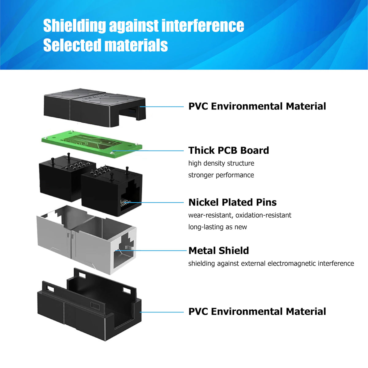 Q: How does the RJ45 Coupler improve network performance?A: The RJ45 Coupler effectively extends the length of your Ethernet cables without reducing internet speed. Its gold-plated connectors ensure strong signal transmission, while built-in shielding minimizes signal interference, optimizing your network performance.
