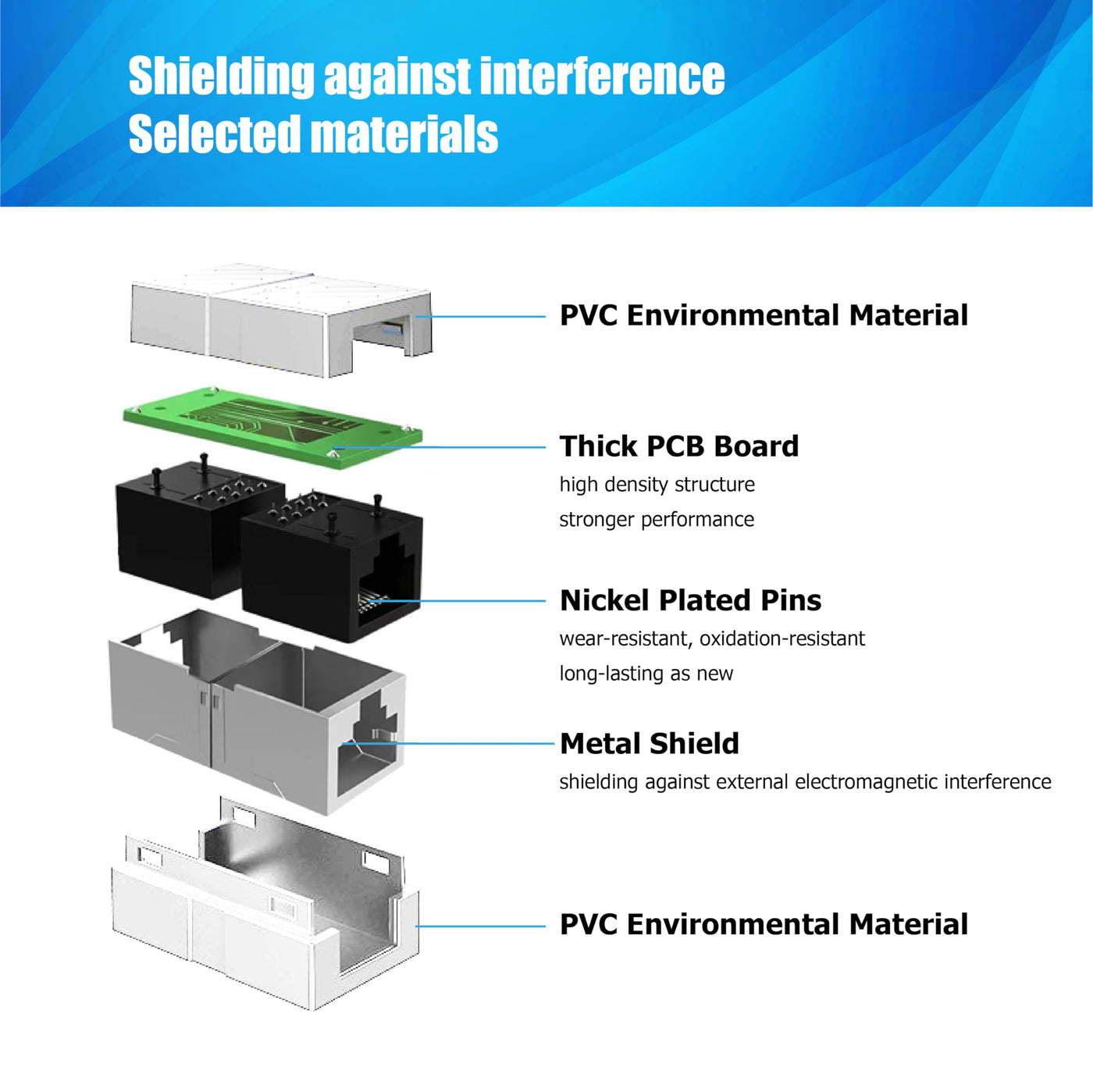 Q: What materials are used in the RJ45 Coupler for signal strength?A: The RJ45 Coupler features pure copper gold-plated tentacles that enhance signal strength and facilitate fast data transmission. Additionally, built-in shielding reduces signal interference, ensuring a reliable connection.