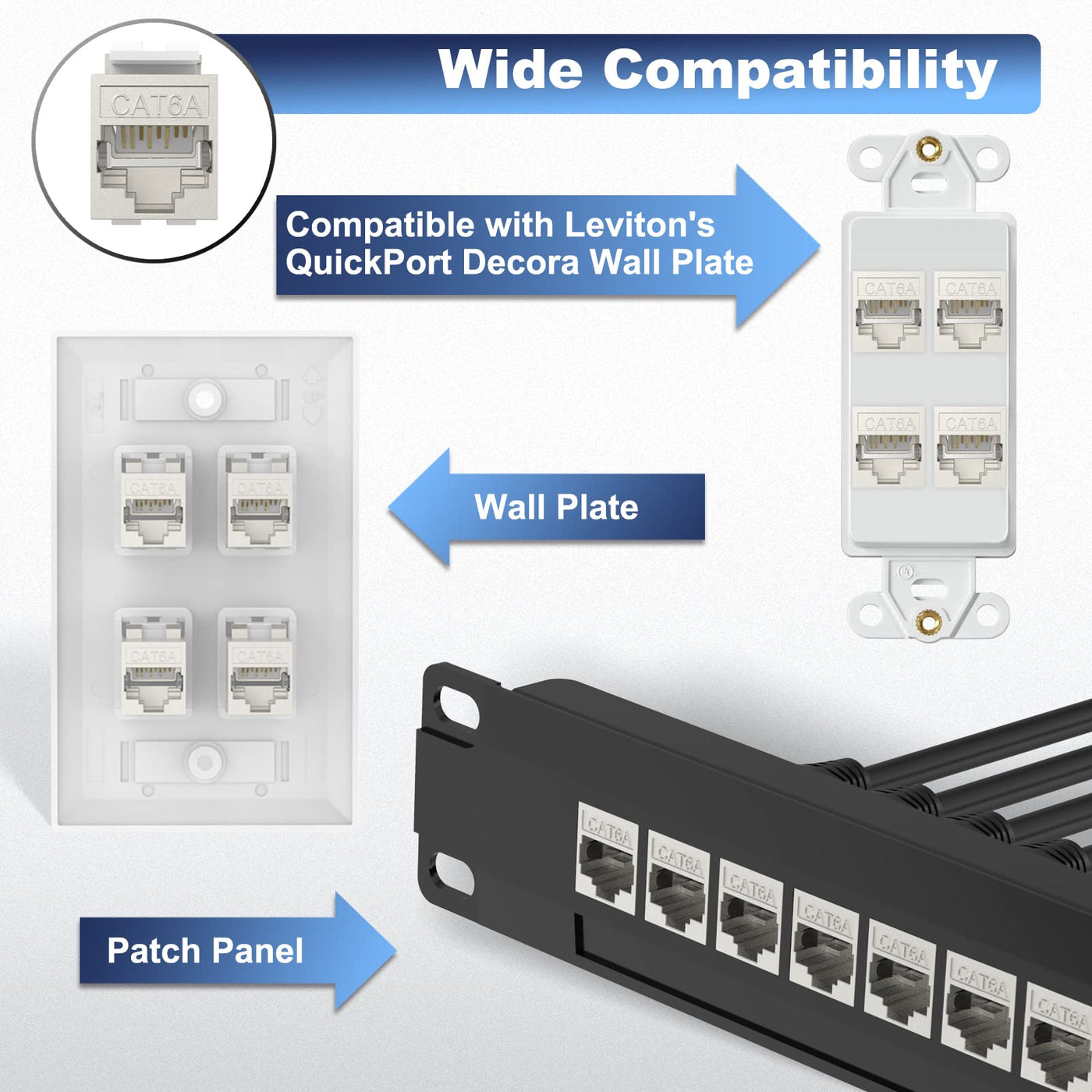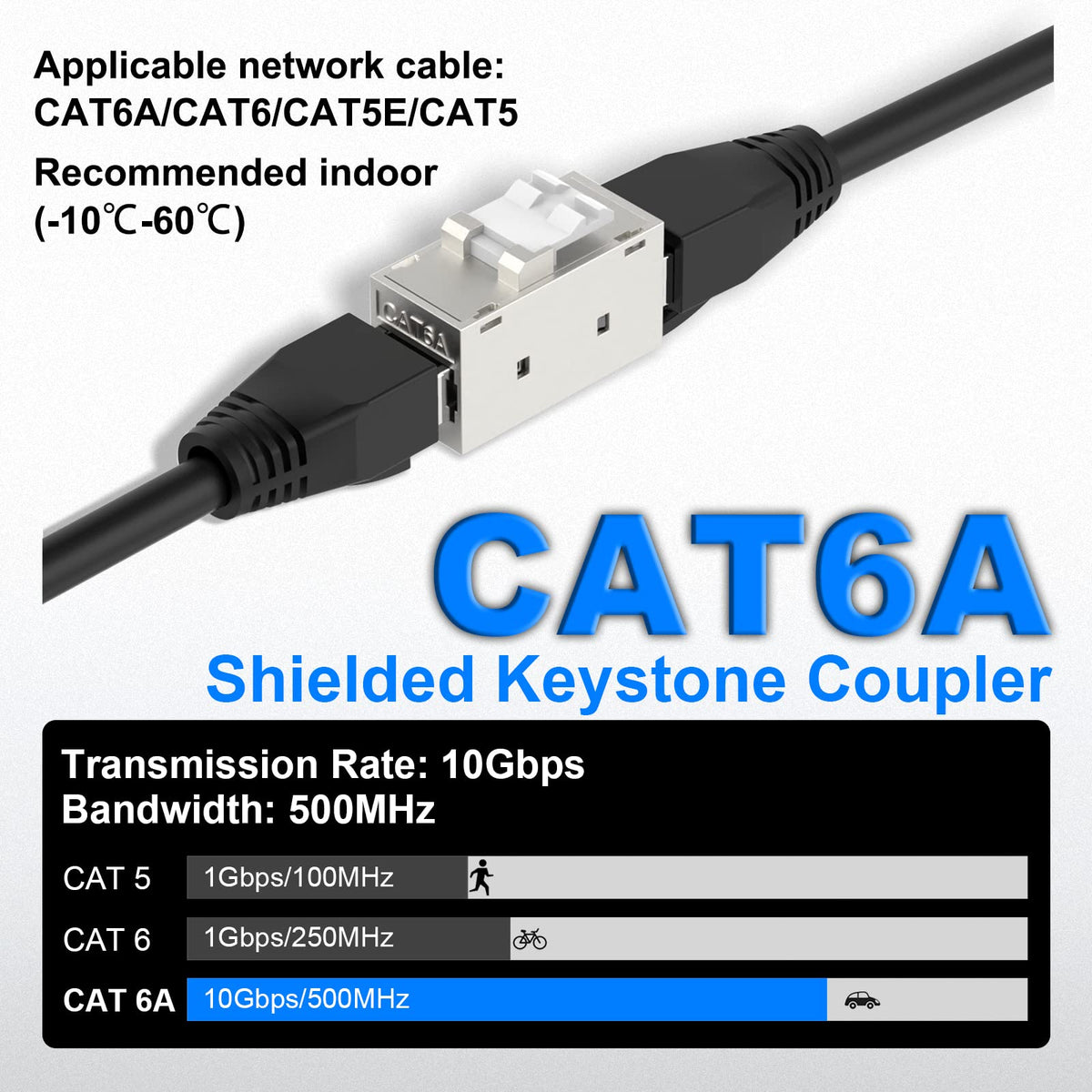 Ethernet Female-To-Female Coupler Can Connect Two Short Cables To Extend The Length Of Existing Cables Without Affecting Network Speed. Solve The Problems Of The Unsuitable Pre-Built Network Port Location And Transmission Distance Limitation, Save Decoration Costs, And Make Wiring More Convenient. Keystone Jack Coupler Can Be Used With Standard Network Panels And Patch Panels To Connect To Laptops, Switches, Routers, And Other Devices With Standard Rj45 Interfaces. The Zinc Alloy Housing Provides Excellent Shielding, Ensuring Stable Signal Transmission Even When Surrounded By Many Electromagnetic Devices, And The S-Shaped Contacts Make The Network Plug Easy To Insert And Prevent Interference. The Cat6A Rj45 Keystone Inline Coupler Is Compatible With Standard 10 Gigabit Ethernet Cables And Can Achieve Network Speeds Of 10Gbps. Compatible With Cat6, Cat5E, And Cat5 Networks. Compact Size Can Save Space And Facilitate Operation. In The Semi-Industrial, Industrial, With High-Speed Transmission Needs, Confidential Information Transmission, Environmental Interference Sources In The Case Of Complex Environments, Internet Cafes, Computer Rooms, Data Centers, And Horizontal Subsystems Using Cat6A Shielded Rj45 Coupler Keystone To Meet The High-Density / High-Efficiency Cabling Needs Of Network Integrated Wiring.
