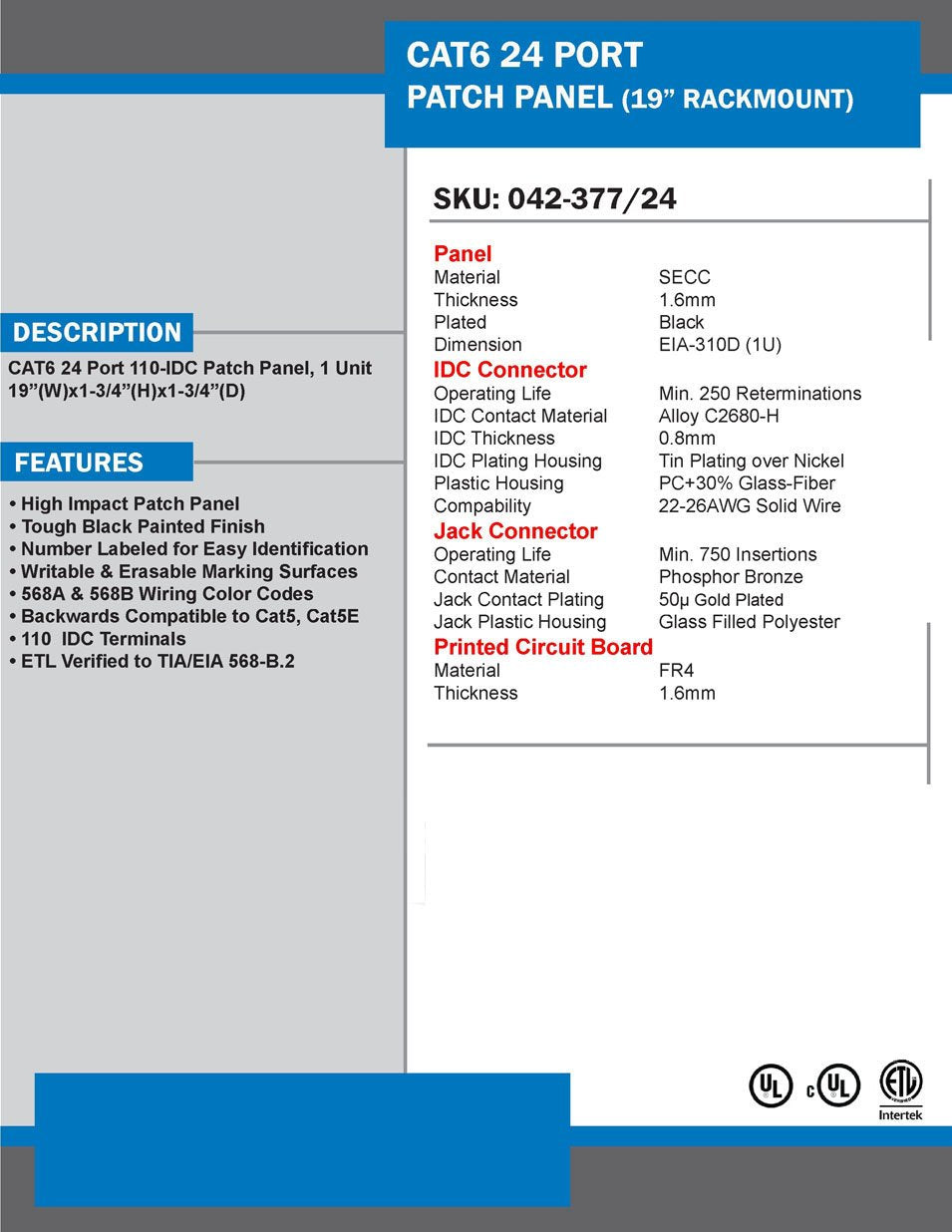 This Product Is A 24 Port 19'' Horizontal Rackmount 1U Cat6 Patch Panel. At The Front It Is Number Labeled For Easy Identification And Has Writable And Erasable Marking Surfaces. Jack Connectors Are Gold Plated To 50 Micron Thickness And The Minimum Operating Life Of Jack Connectors Is 750 Insertions. The Minimum Operating Life Of The 110 Idc Connectors Is 250 Terminations And They Are Compatible With 22 To 26 Awg Solid Wires. Brand For This Product Is Vertical Cable.