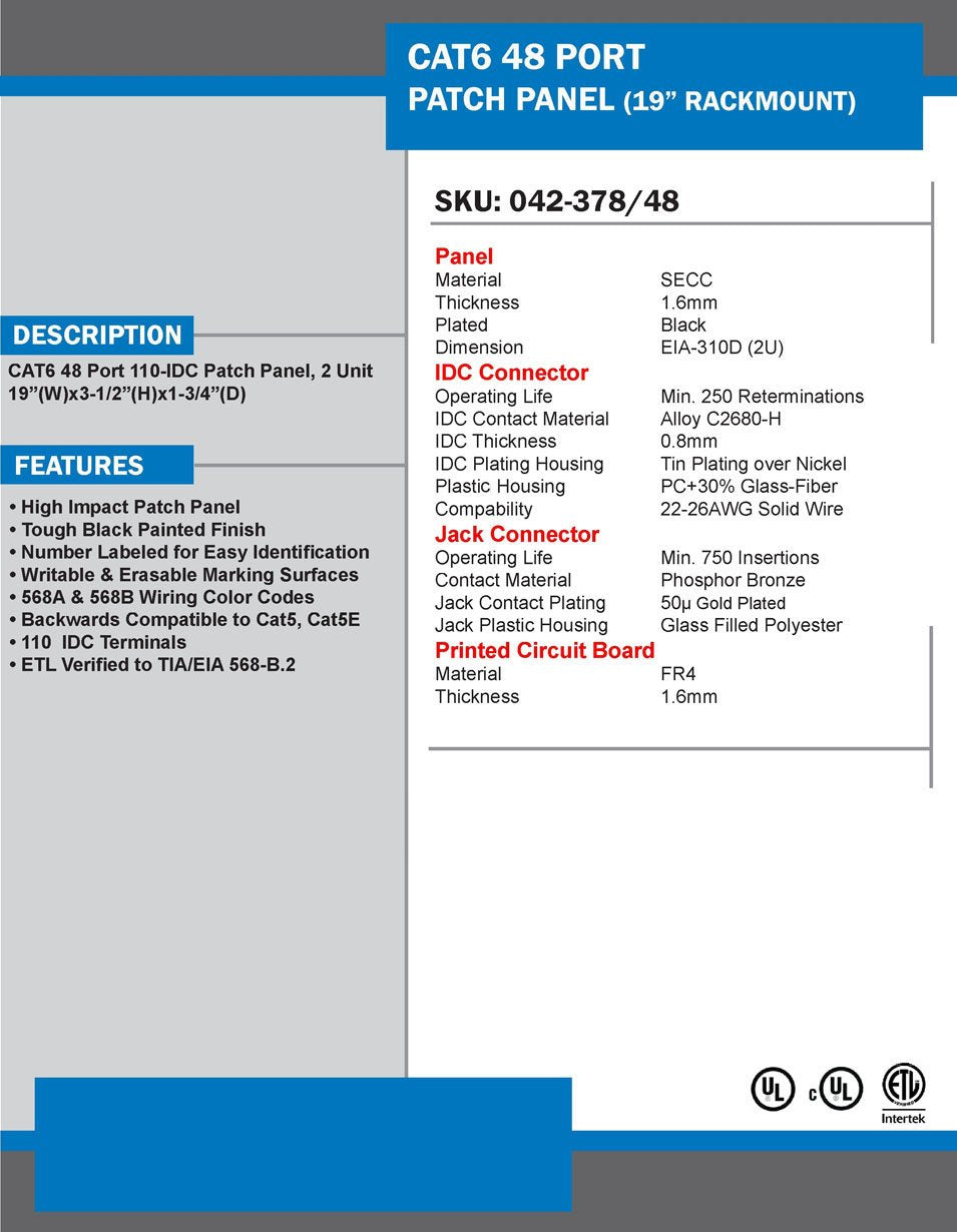 This Product Is A 48 Port 19'' Horizontal Rackmount 2U Cat6 Patch Panel. At The Front It Is Number Labeled For Easy Identification And Has Writable And Erasable Marking Surfaces. Jack Connectors Are Gold Plated To 50 Micron Thickness And The Minimum Operating Life Of Jack Connectors Is 750 Insertions. The Minimum Operating Life Of The 110 Idc Connectors Is 250 Terminations And They Are Compatible With 22 To 26 Awg Solid Wires. Brand For This Product Is Vertical Cable.