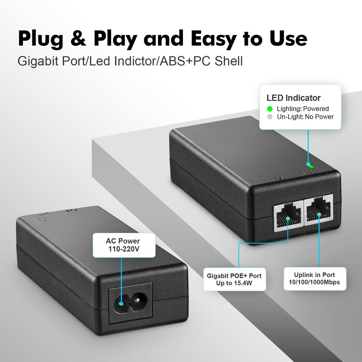 Gigabit Poe+ Injector, 802.3Af 15.4W, 10/100/1000Mbps Ethernet, Plug & Play, Non-Poe To Poe Adapter, Distance Up To 100 Meters (328 Ft.)