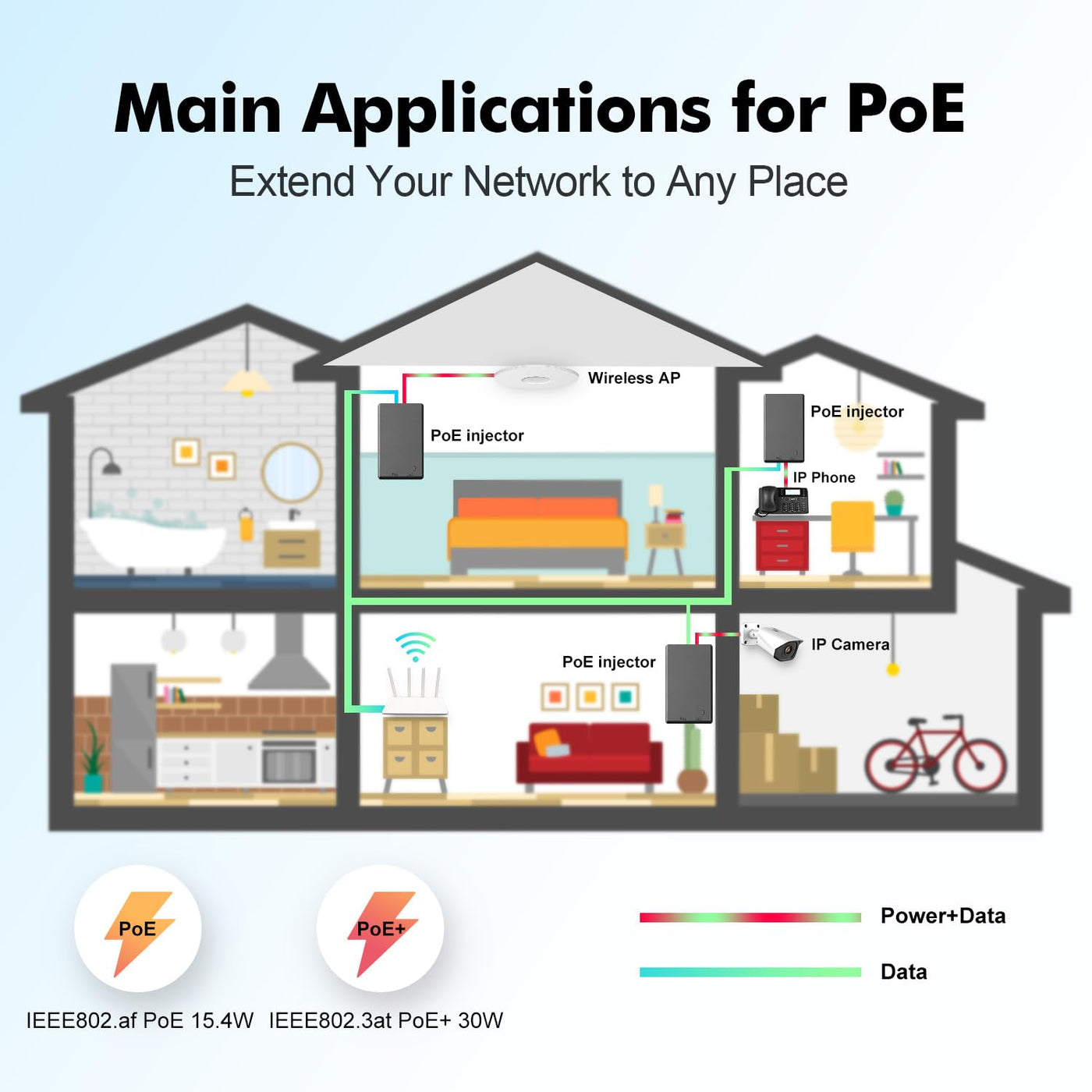 Q: What types of devices can I connect to the YuLinca PoE Injector?A: You can connect various devices such as wireless access points, Wi-Fi routers, network cameras, and other PoE devices, making it widely used in homes, businesses, shops, and private networks.