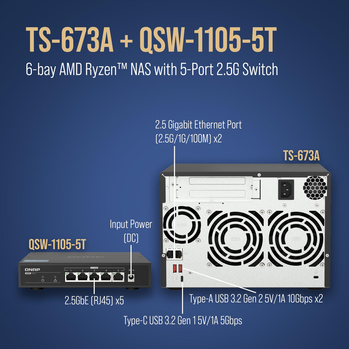Qnap Ts 673A 6 Bay Amd Ryzen Quad Core 2.5Gbe Nas With Qsw 1105 5T 5 Port 2.5Gbe Unmanaged Switch