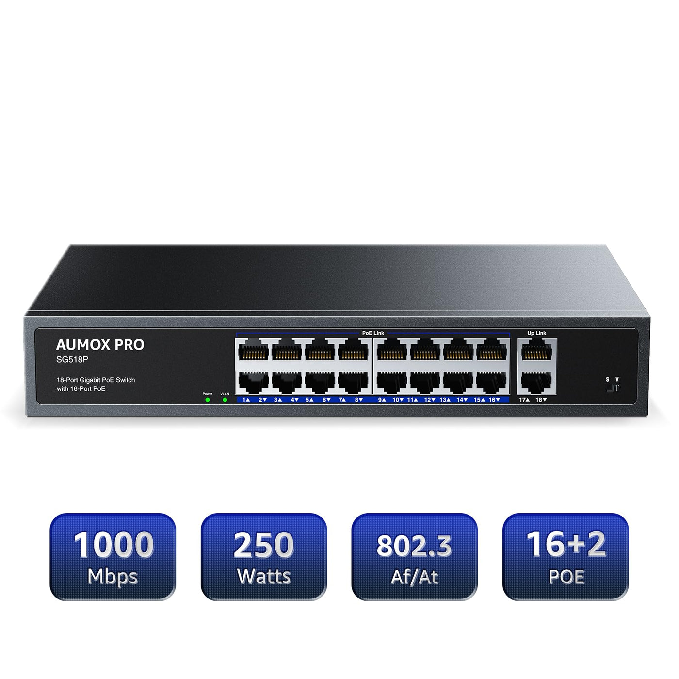 16 Port Gigabit Poe Switch,Aumox Pro 18 Port Poe With 2 Uplink Gigabit Ports 250W,Plug And Play,Metal Case Desktop, Wall Mount Or Rackmount Network Switch, 802.3Af/At