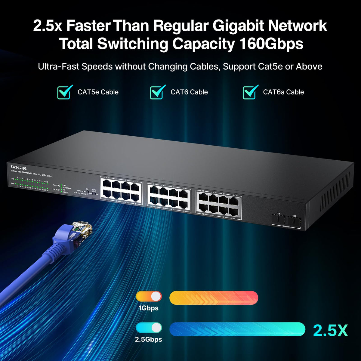 24 Port 2.5G Web Managed Ethernet Network Switch 24 X 2.5 Gigabit | 2 X 10G Sfp+ | Work With 10 100 1000Mbps Devices | 160G Band