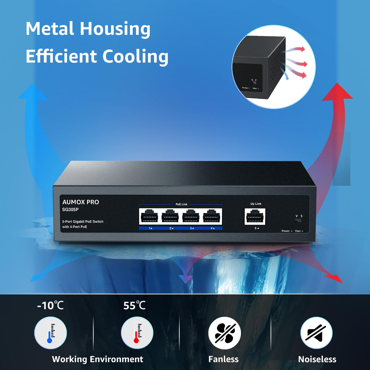 Q: Does the AUMOX PRO switch operate quietly?A: Yes, the AUMOX PRO 5 Port PoE Switch has a fanless design, which ensures that it operates without any noise, making it ideal for use in quiet environments.