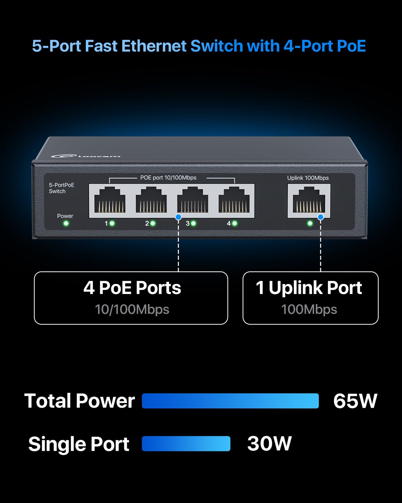 Q: What is the maximum power output of the 5 Port PoE Switch?A: The 5 Port PoE Switch has a total PoE power budget of 65W, with each of the 4 PoE+ ports capable of delivering up to 30W.