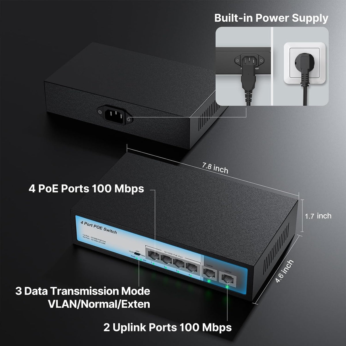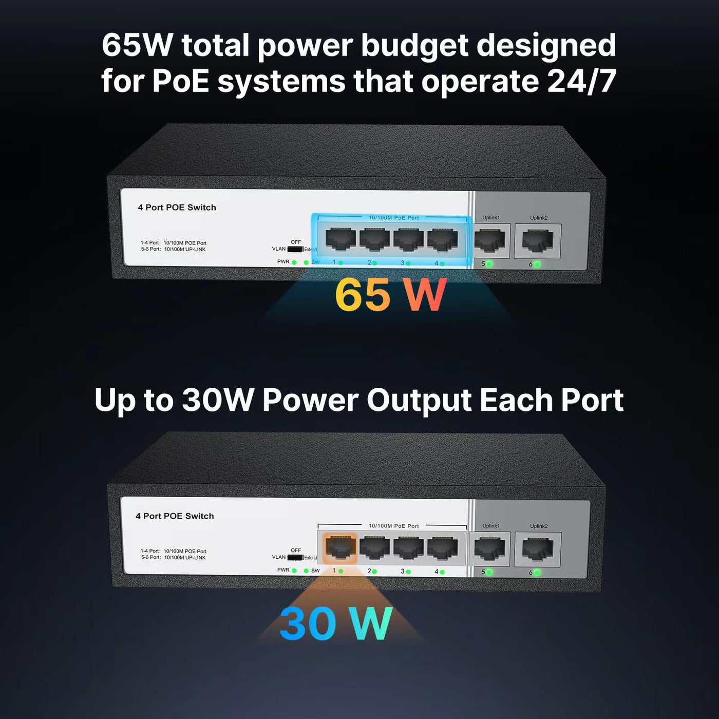 6 Port Poe Switch, 4 Ports 10/100Mbps Poe+ 2 Ethernet Uplink, Total Power Budget 65W, 803.Af/At Compliant, Compatible With Ip Ca