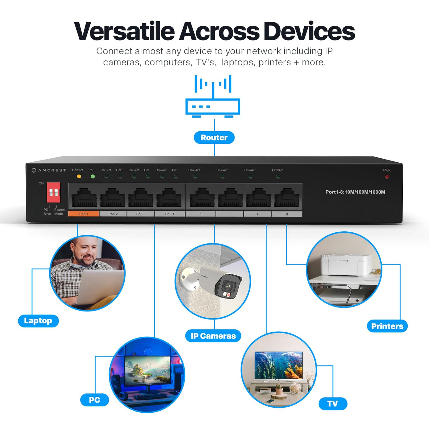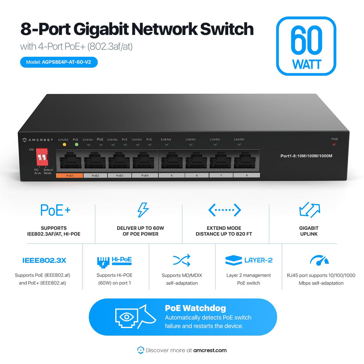 Amcrest 8 Port Switch With 4 Ports Poe+ 802.3Af/At 60W, Metal Housing, (Agps8E4P At 60 V2)