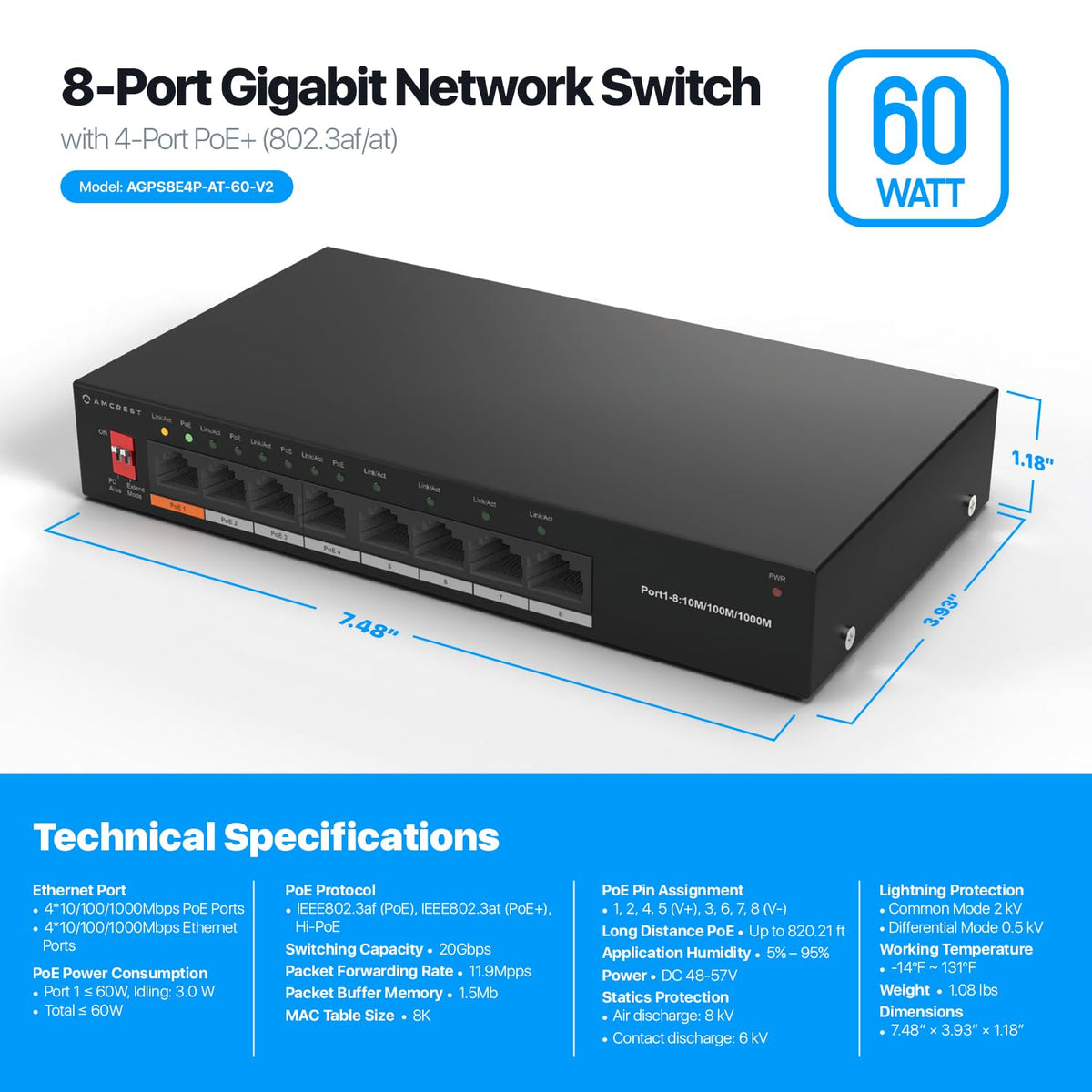Amcrest Model: Agps8E4P-At-60-V2 Gigabit/Poe Switch Features: Data Transmission: Port 1-4: 4 Rj-4510/100/1000 Mbps (Poe), Port 5-8: 4 Rj-45 10/100/1000 Power Supply: 48 V-57 V Dc Power Consumption: Idling: 3W, Full Load: 60W Communication Standard: Ieee802.3; Ieee802.3U; Ieee 802.3Ab; Ieee802.3X Poe Standard: Ieee802.3Af; Ieee802.3At; Hi-Poe Poe Power: 60W Switching Capacity 20Gbps Packet Forwarding Rate: 11.9Mbps. Packet Buffer Memory: 1.5Mb Mac Table Size: 8K. Flow Control: Enabled By Default. Storage Humidity: 5%-95% (Rh) Static Protection: Air Discharge: 8 Kv; Contact Discharge: 6 Kv Thunder-Proof: Command Mode: 2Kv, Differential Mode: 0.5Kv. Working Temperature: 14F ~ 131F. Dimensions: 7.5 X 3.9 X 1.18 Inches. Weight: 1.08 Lbs. Package Includes: 1 X 8-Port Gigabit Switch With 4-Port Poe (Agps8E4P-At-60-V2)
