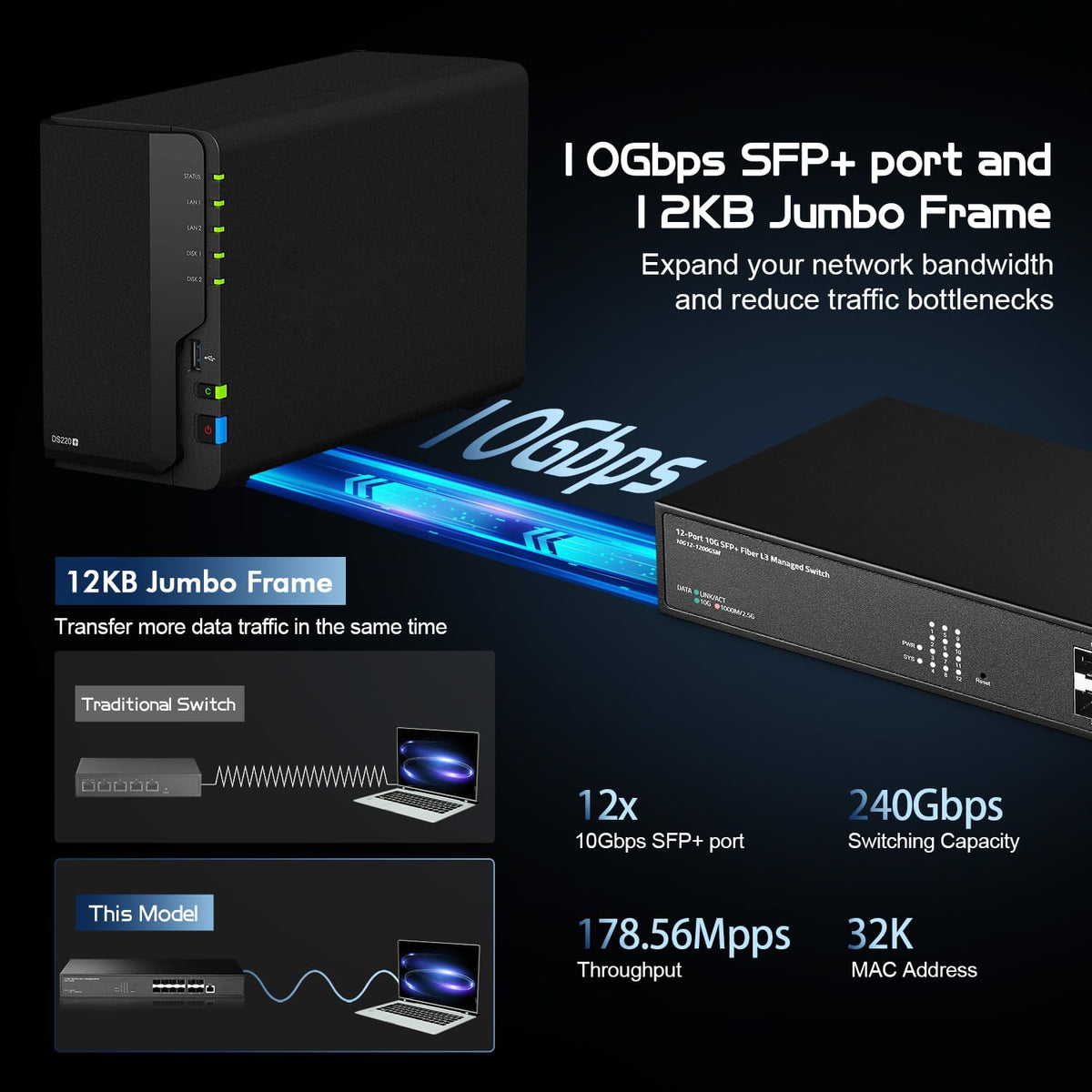Binardat 12 Port 10 Gigabit Sfp Managed Switch, Support 1G Sfp And 10G Sfp+ Module, 240Gbps Bandwidth, L3 Web/Cli Managed, Metal