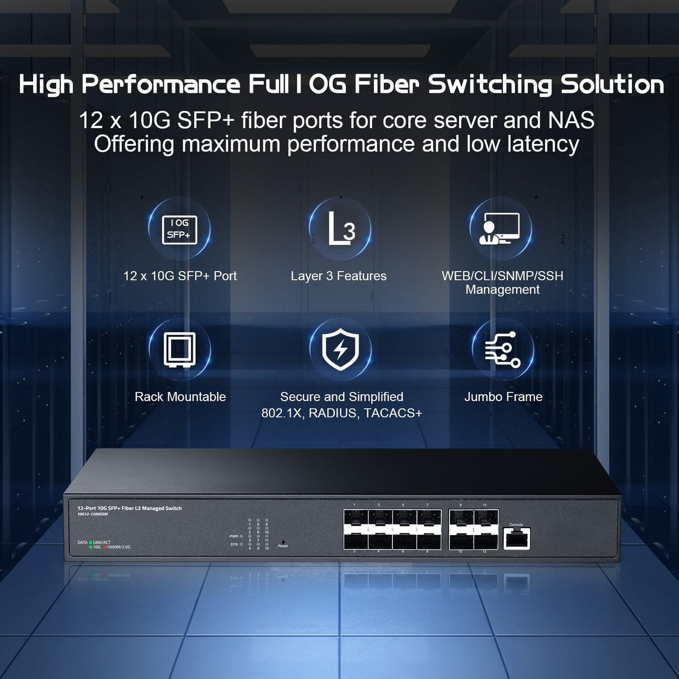 Binardat 12 Port 10 Gigabit Sfp+ Managed Switch, Support 1G Sfp And 10G Sfp+ Module, 240Gbps Bandwidth, L3 Web/Cli Managed, Metal Rackmount Fiber Network Switch