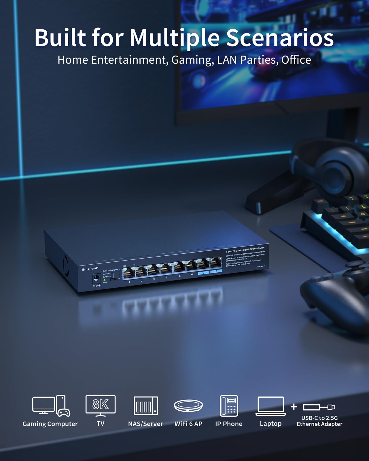 Q: What devices are compatible with the BrosTrend 8-Port 2.5G Ethernet Switch?A: The BrosTrend 8-Port 2.5G Ethernet Switch is compatible with a wide range of devices, including gaming PCs, game consoles, laptops, TVs, WiFi access points, and NAS devices. It can enhance the performance of any device that supports Ethernet connectivity.