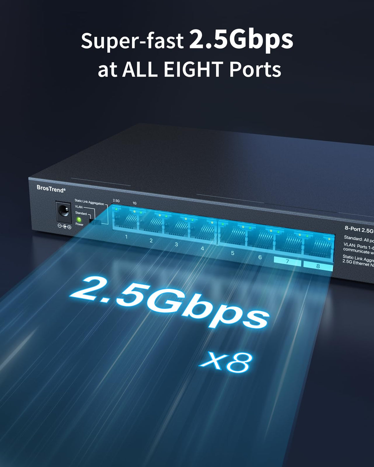 Brostrend 8 Port 2.5G Ethernet Switch Multi Gigabit Unmanaged Network Switch 2.5Gb Switch Supports Static Link Aggregation & Vla