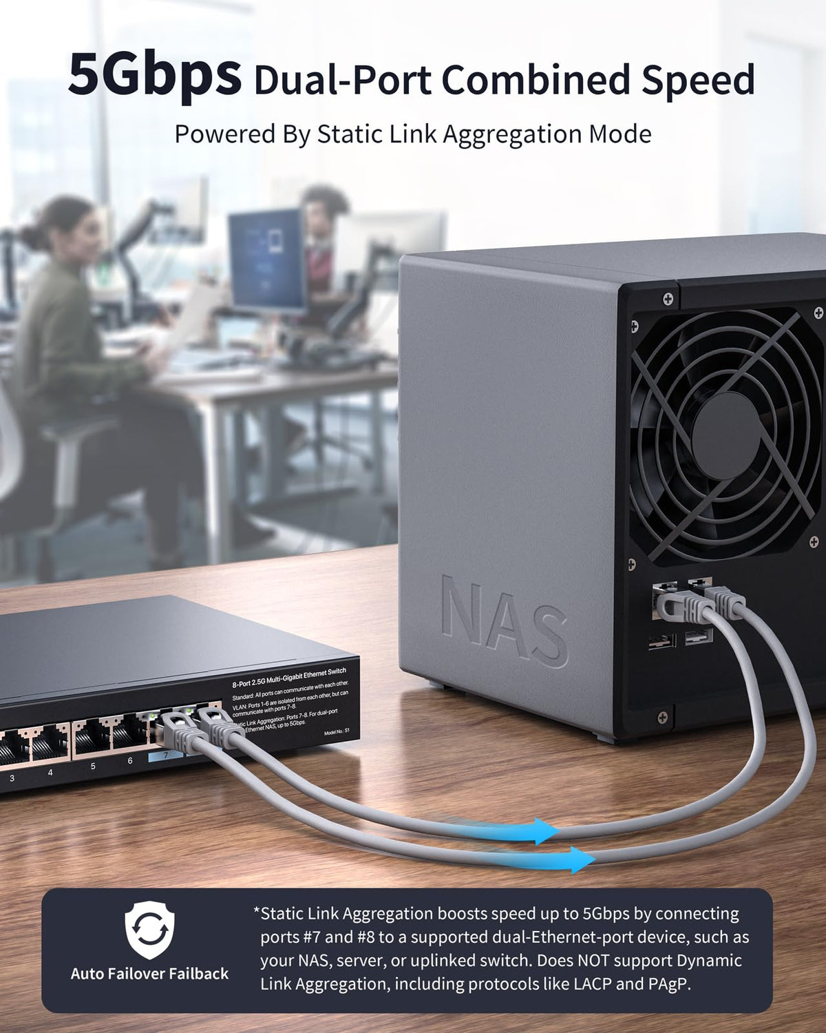 Q: How does the Static Link Aggregation feature work?A: The Static Link Aggregation feature allows you to bond two Ethernet ports together, effectively combining their bandwidth for a total of up to 5Gbps. This is ideal for devices like NAS or servers that require high-speed data transfer, ensuring faster file sharing and streaming capabilities.